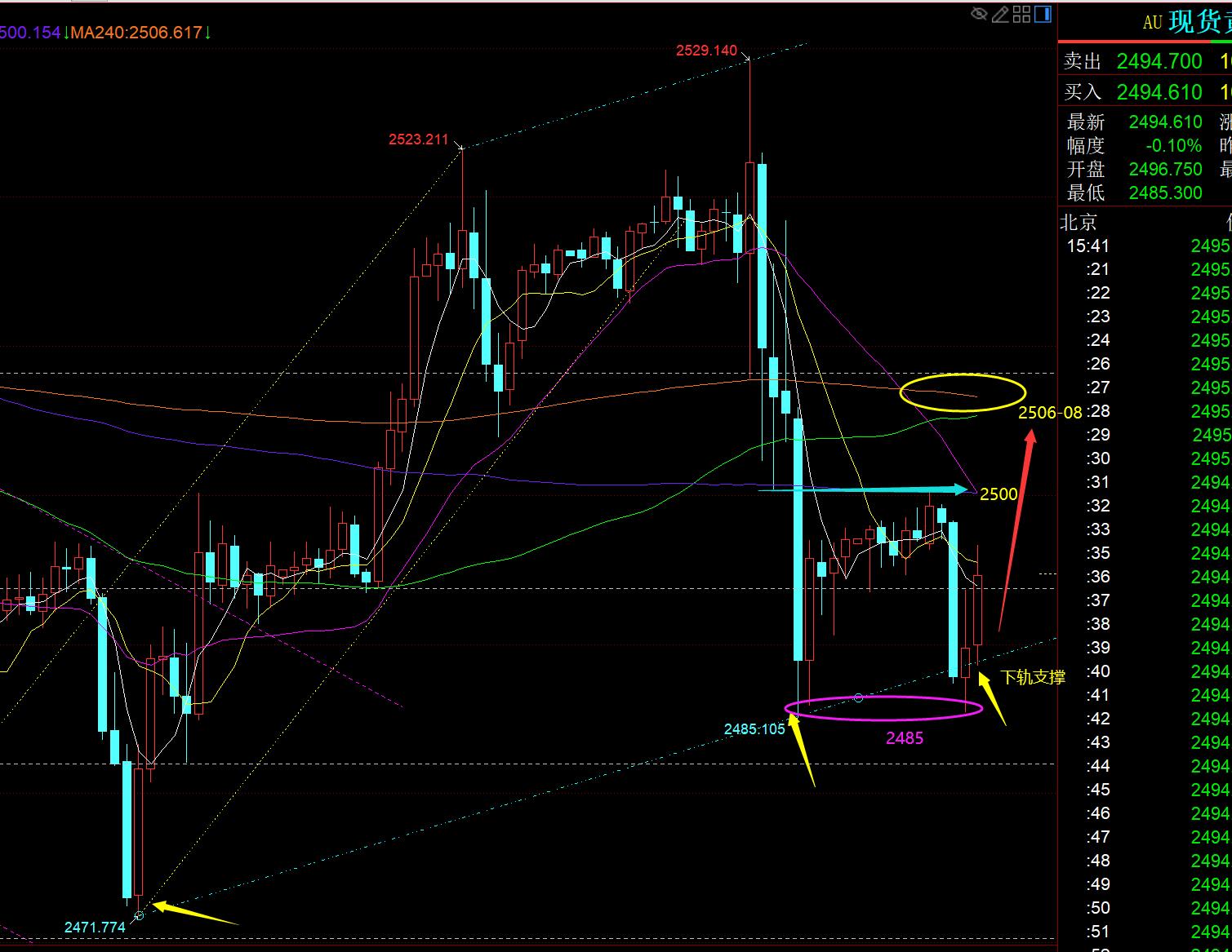 第四,黄金小时线级别:根据周视频推演的新通道,今日早间先下探2487下轨则是看反弹时机,或先上拉2506-08是看回落下跌时机,然而这两个价格都未在10点前后给到; 当午后承压2500关口下跌一波,给到2485.5,出现小双底迹象企稳信号,则依然可以参考新通道下轨支撑去看一波反弹,阻力2500和2506-08;对于接下来欧美盘走势,重点关注2506-08压力得失情况,若直接突破上行了,今晚就很容易再去2520及上方,日线就会形成大阳反包;反之,若下行失守2485支撑,则有望再去试探2470的可能;