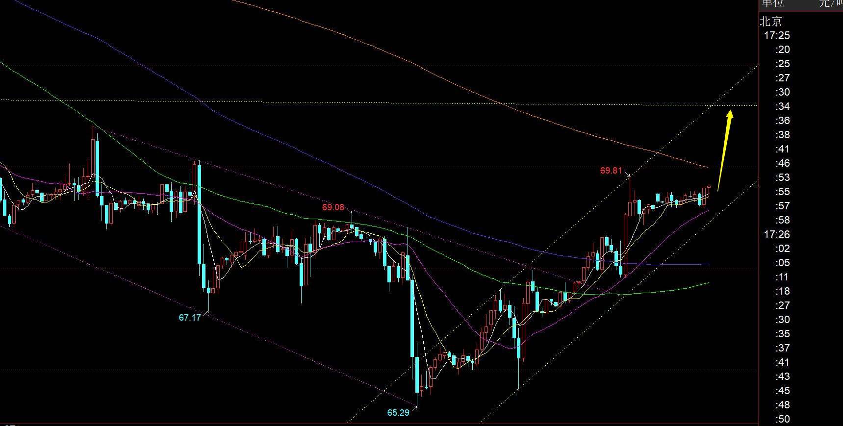 第三,原油方面:前几日持续压制趋势阻力线走弱,昨日亚欧盘也是先依托阻力线测试看压制,下探之后再去看涨反弹,但昨日欧盘首次出现了走强突破,意味着走势即将迎来超跌反弹,计划67.5跟随看涨,但比较可惜,只触及67.8,错失了一波拉升;