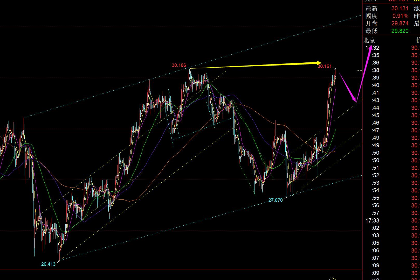 白银方面:从图中看,白银也基本走出了底部整理通道,短期向上发力上攻,不过临近前高30.18阻力,也不好追涨,相对理想的走势则是等待紫色箭头回踩确认一波,再29.3支撑之上找位置企稳去跟随看涨,后市有望指向大通道上轨31.2一线;