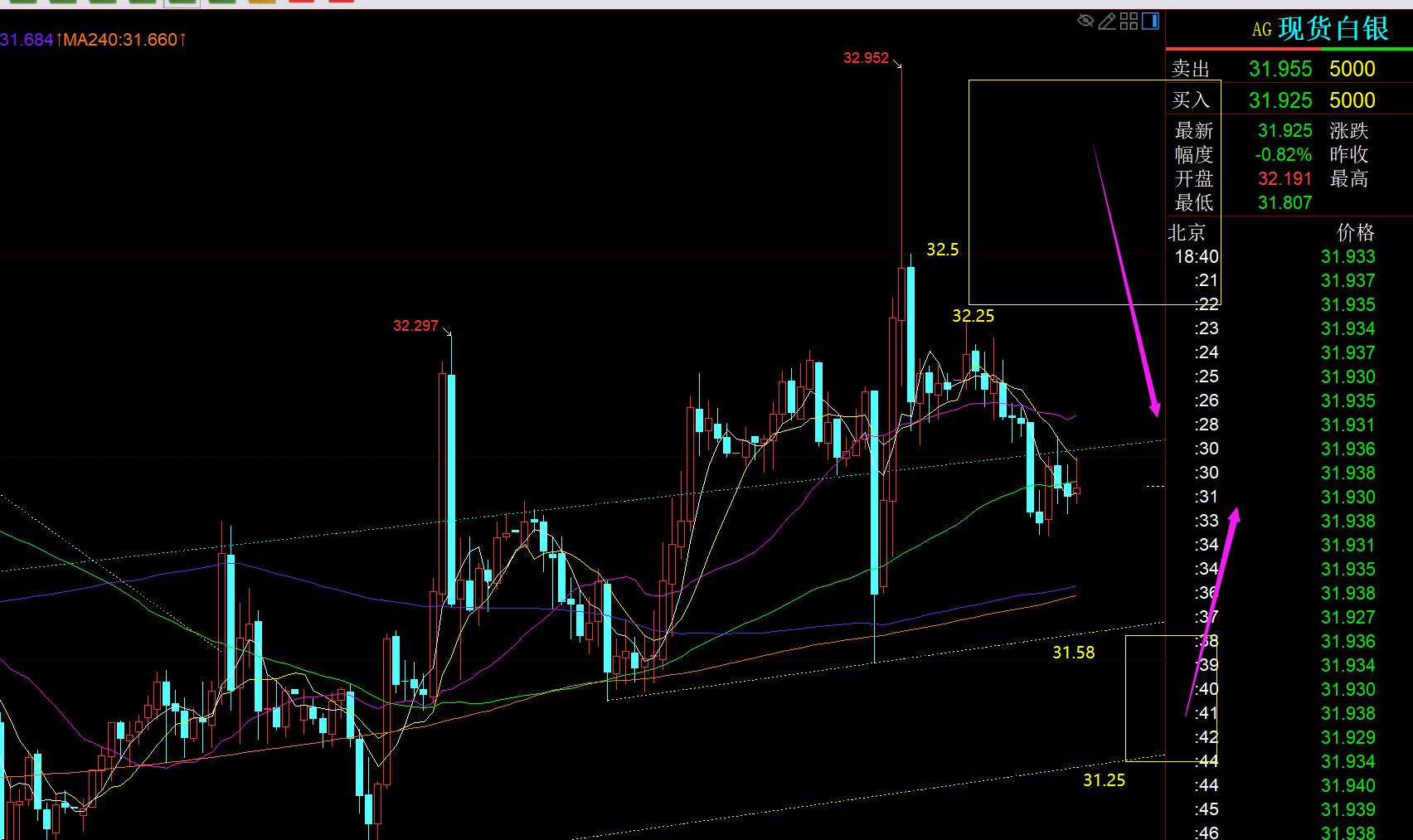 白银方面:白银的走势今日比黄金弱些,支撑31.58和31.25,此区域范围得到企稳形态,即可逢低震荡看涨;阻力32.25、32.5,拉高受到承压信号,即可逢高震荡看跌;这种波动率大,区间又大,速度又快的走势,靠的是胆量和果断,稍微犹豫可能就错失最佳点,之后步入中间位置就很难下手,容易错失;