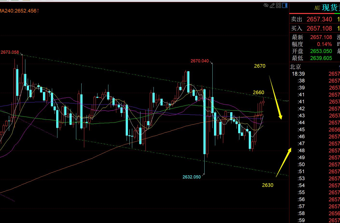 第三,黄金小时线级别:目前走势还是符合周视频解读,以2650一线作为中轴,下20美金是2630,上20美金是2670,进行反复的来回串整理,因此今晚思路也比较简单,继续高抛低吸即可;由于震荡过程中,很容易发生刺破支撑或阻力现象,所以只要仓位降低,防守适当放开些,问题就不大;那么,今晚2660-2670都可震荡看跌,2630上下都可震荡看涨;