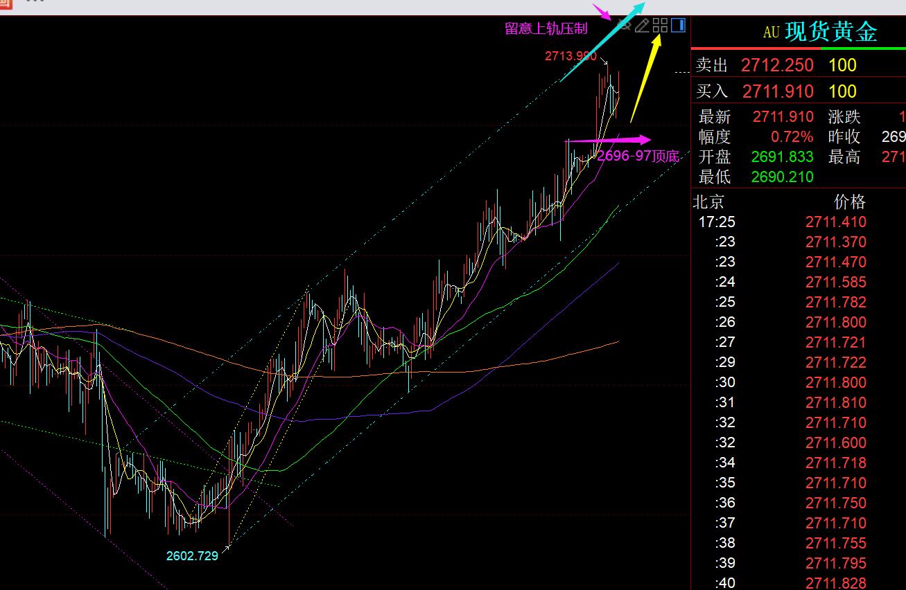 三,黄金小时线级别:早间又是和昨日一样,开盘直接走高,隔夜2688看涨也就顺势拿下,最终于2710下方逢高收割,因为后面的走法可能和昨日美盘会相似,进行高位反复来回磨;昨日通过浪分析过,目前这第三浪的最低倍数的高度有望会靠近2729一线,所以短线来讲还有一定高度可走;风水岭则是2690早间起涨点,以此作为防守,依托顶底支撑2696-97上继续顺势看涨即可,触及靠近2729上下5美金范围内就要谨慎出现调整,若按照1.618倍数,三浪高度是2741左右,然后结合图中的上行通道对应的上轨位置,大概会指向2725-2730;因此,综合来讲,今晚2696-97之上逢低继续保持看涨,阻力2725-2741范围内谨慎出现四浪回调;