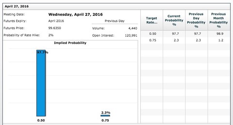 对于4月26-27日的美联储议息会议,目前市场上普遍认为加息概率很小,如下图所示,这是CME官网对2016年每次美联储议息会议的加息概率的预测,本次是97.7%概率不加息。