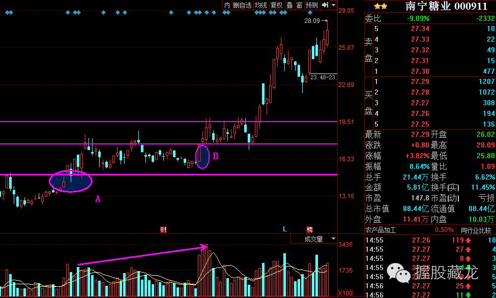 同时,南宁糖业在6.17-6.25调整了7个交易日,目前正处于又一波主升浪过程中,且下方的成交量峰值从4.20日开始依次缩量,这说明机构持续锁仓,那么南宁糖业很有可能在走最后一波主升浪。