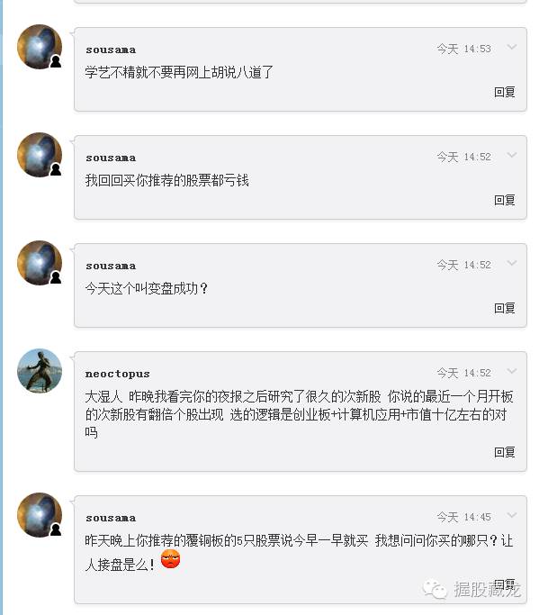 现在回过头来看,是我对了,他错了。但是这种同学很多很多,Sousama只是一个典型代表而已。其实这种同学质疑我,对我几乎产生不了影响,因为毕竟我也是经历过一夜七次的男人。但是如果你总是用这种阴谋论的想法去看别人,你很难获得成长;一个很简单的道理,如果我想让你去接盘,我不可能同时推4个股,应该是只推一个股才能让大家去接盘。实际上,茂业通信也被我卖飞了啊,选股对了,持股出问题了!