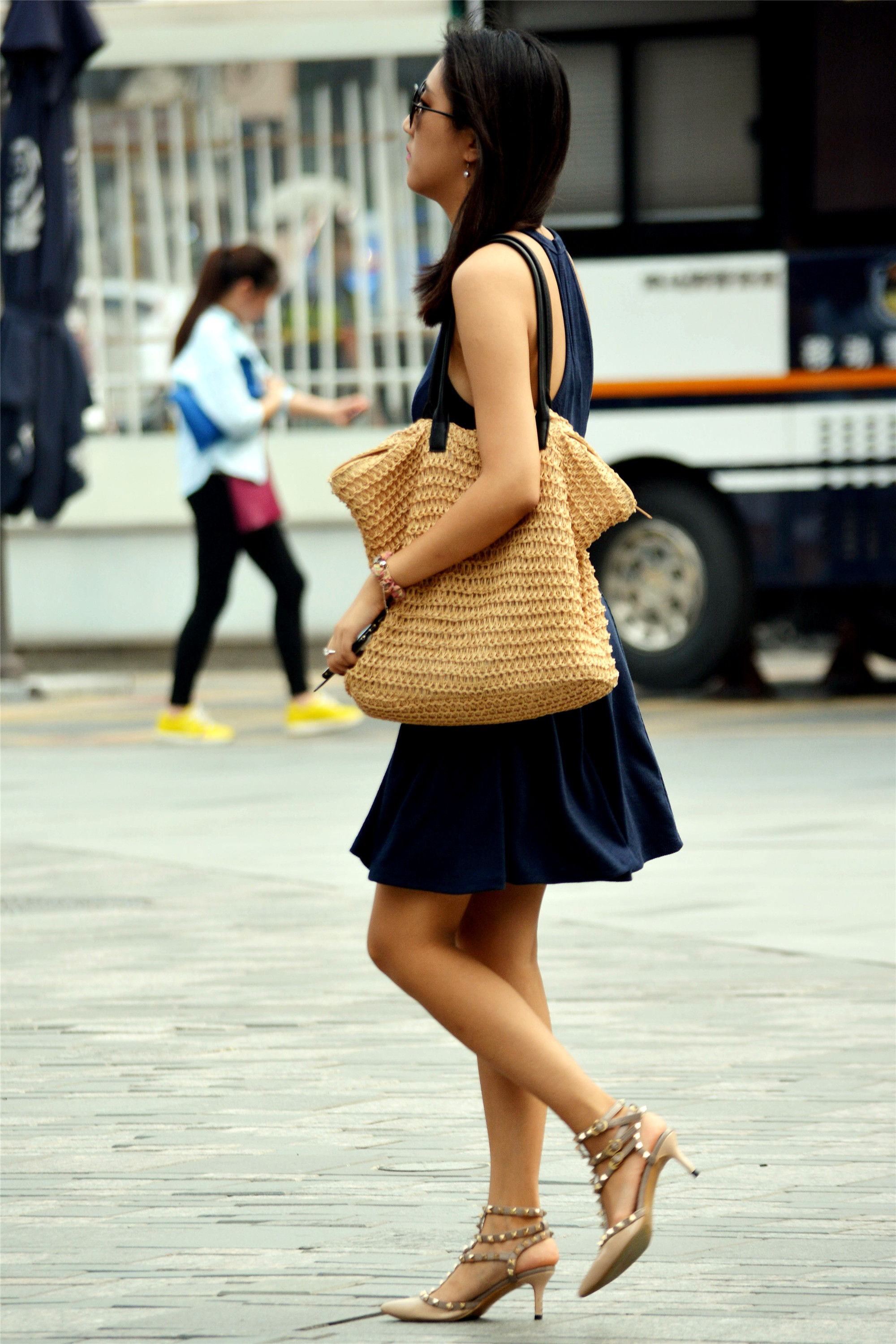 深蓝色的无袖连衣裙,会让你看起来更瘦一些,而黄色针织感的拎包,会有一种收获的感觉,一双米色的铆钉尖头鞋,让她更有气质一些。
