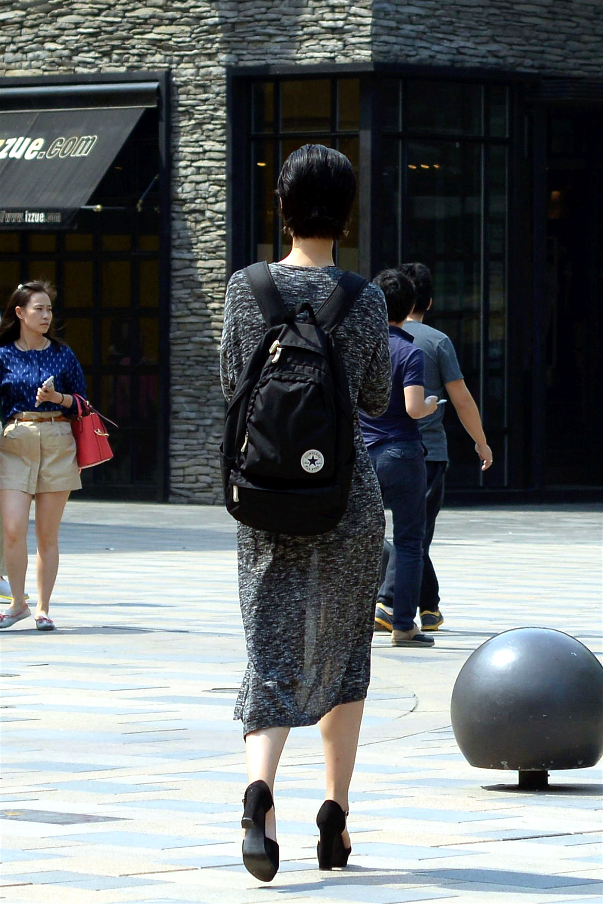 小姐姐这一件深灰色的连衣裙,带着一点纯棉感觉,轻柔舒适,搭配一双黑色粗跟鞋,显得很为重,走路也更平稳。