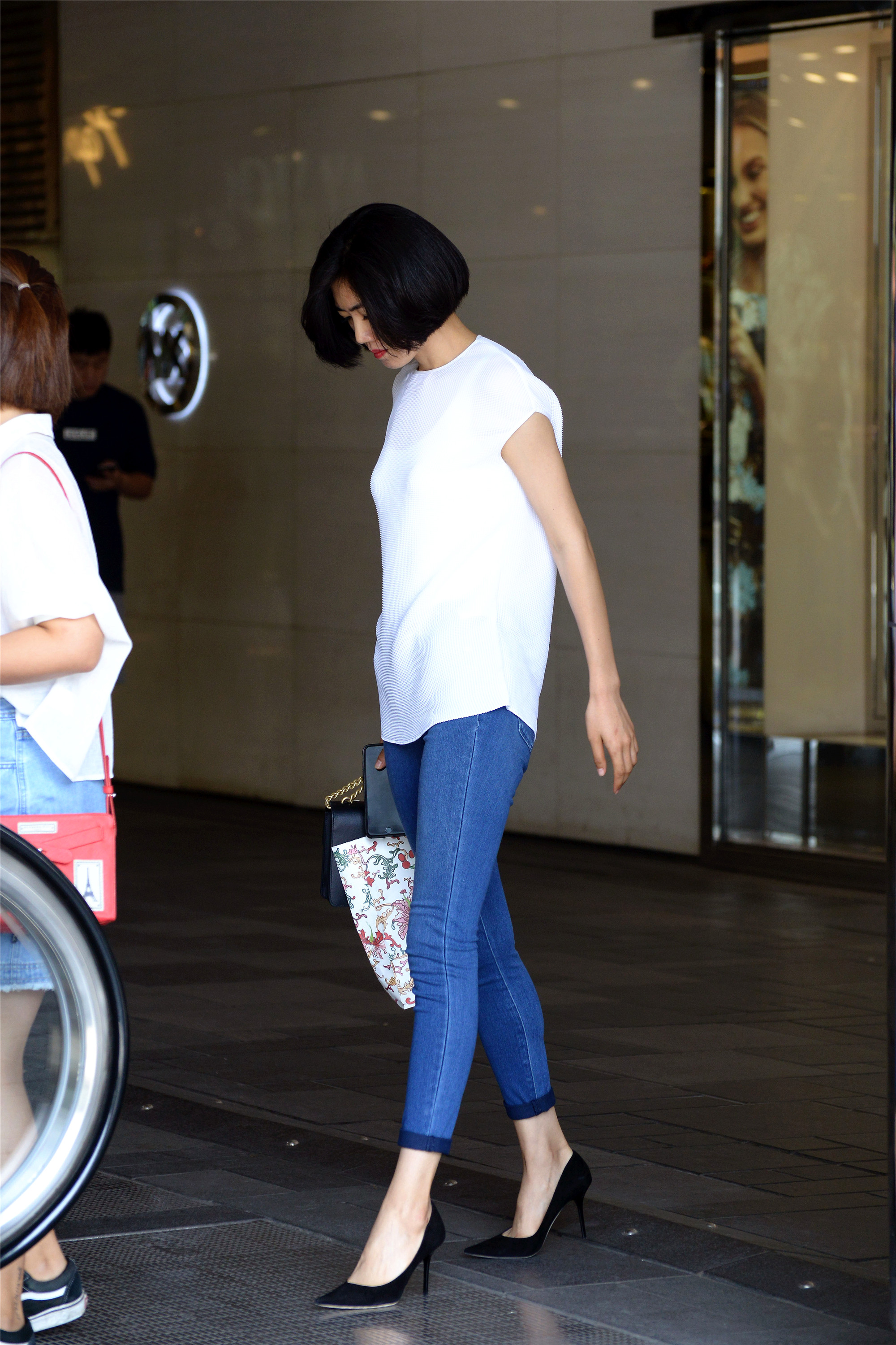 这位小姐姐穿着非常简单,一件白色小衫,简约干净,宽松感觉非常舒适,一条弹力牛仔裤,九分长度恰好秀出脚踝一下,那一双简约的尖头细高跟,是经典的鞋子之一,是很多人喜欢的款式。