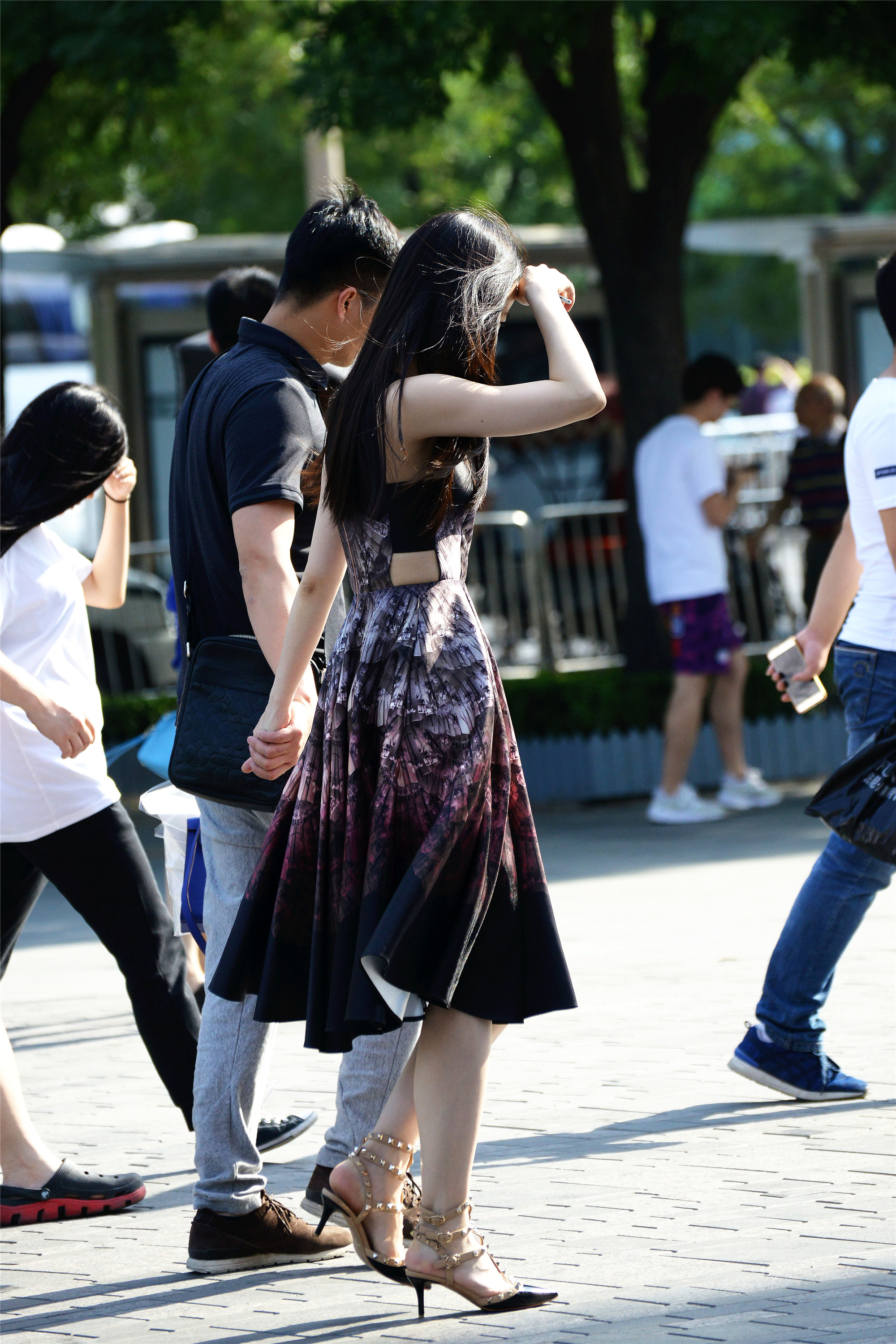 这条渐变色的连衣裙,很显腰身,也带着很厚重的感觉,高挑的姑娘穿着它会很大气,当然一定要选一双高跟鞋,来衬托这款裙子,姑娘用一双铆钉的尖头细跟鞋,看起来很美,而且很适合逛街。