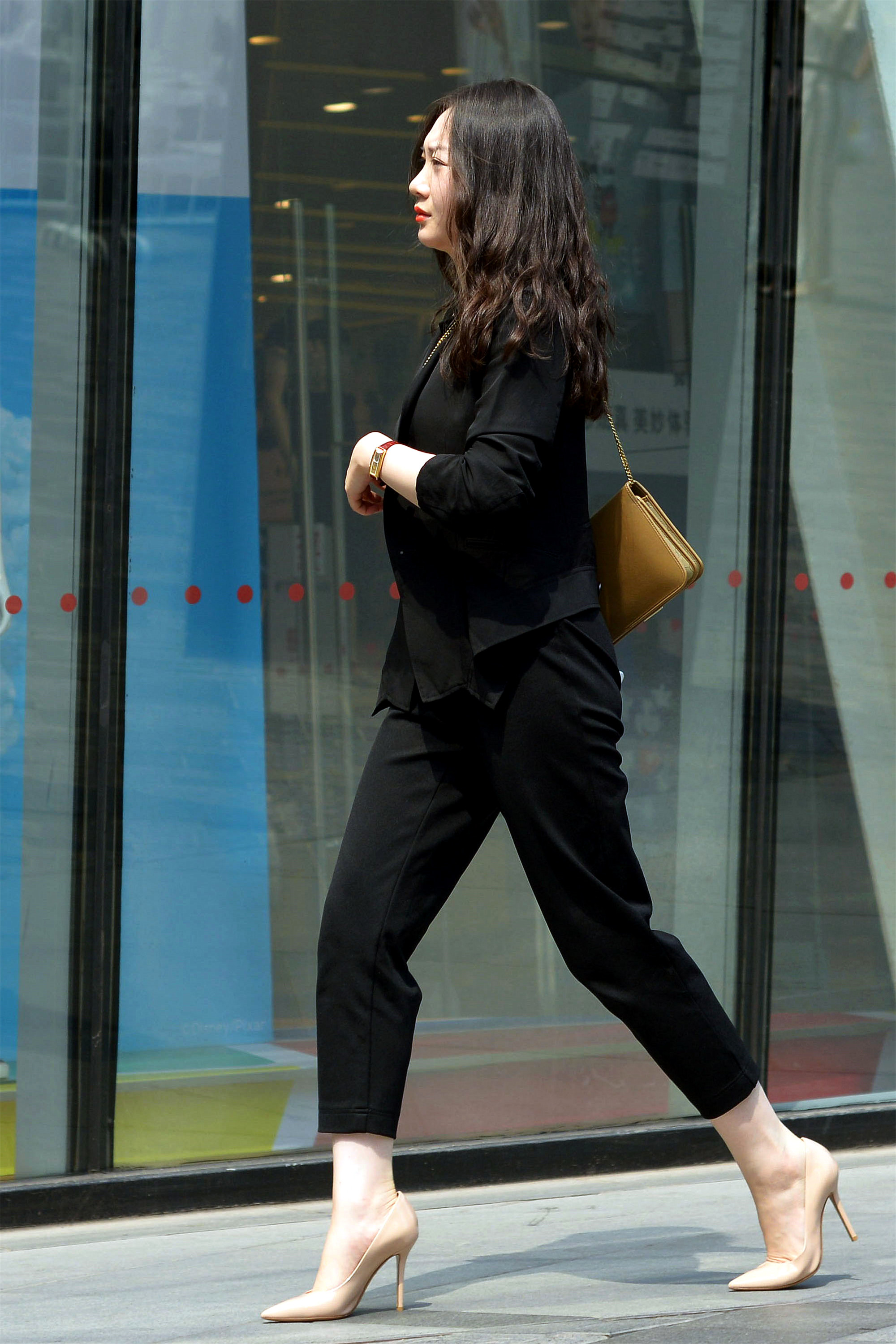 一身黑色也可以搭配出很精彩来,要注意干净利落,不繁琐,简单的休闲西装搭配一条九分窄脚裤,秀出脚踝,与下面的裸色尖头细跟鞋,就这样简答的搭配,却非常出彩,让你看到虽然穿着黑色,但是却非常耐看的感觉。