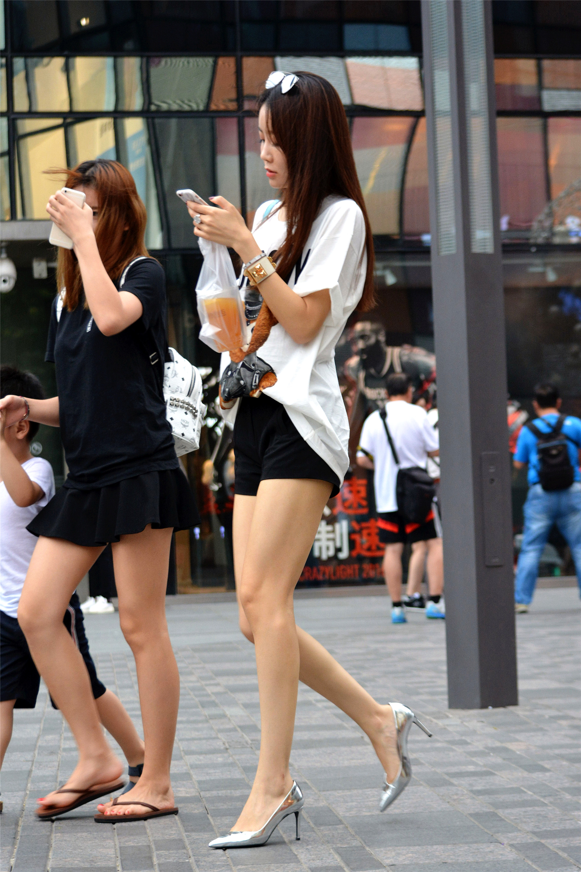 银色尖头细跟鞋,带着反光感,有种未来金属质感,黑色短裤搭配一件白色大T恤,前襟掖在短裤里面,这样更显身材比例感,而且将自己匀称修长的身材秀出来。