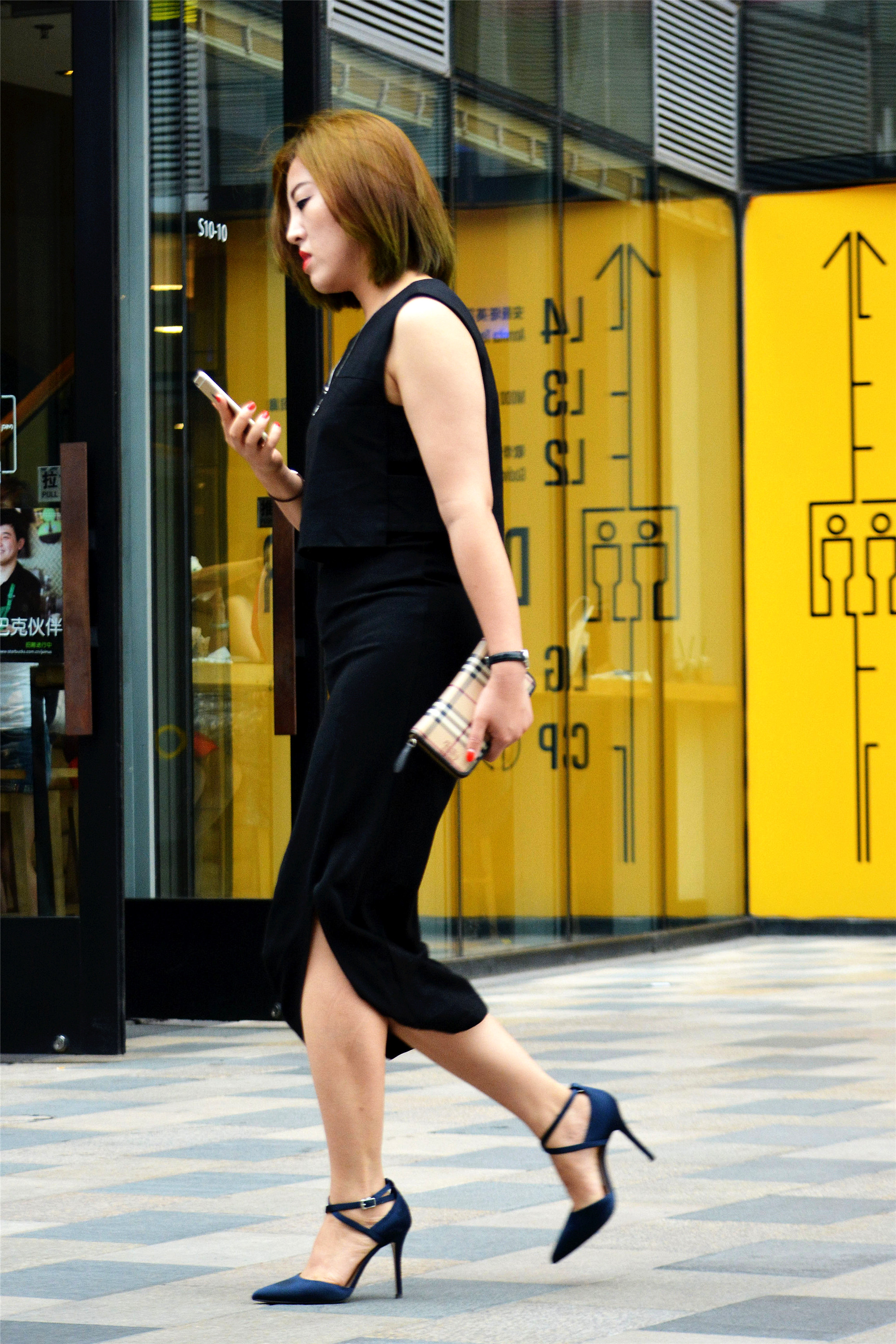 小姐姐这件黑色立体感很强的连衣裙,虽然不会显出身材曲线,但是微微带着一点透视的效果,却让她看起来更显神秘一些,一双金色尖头细跟鞋,带着金属质感和黑色搭配在一起也很时尚。