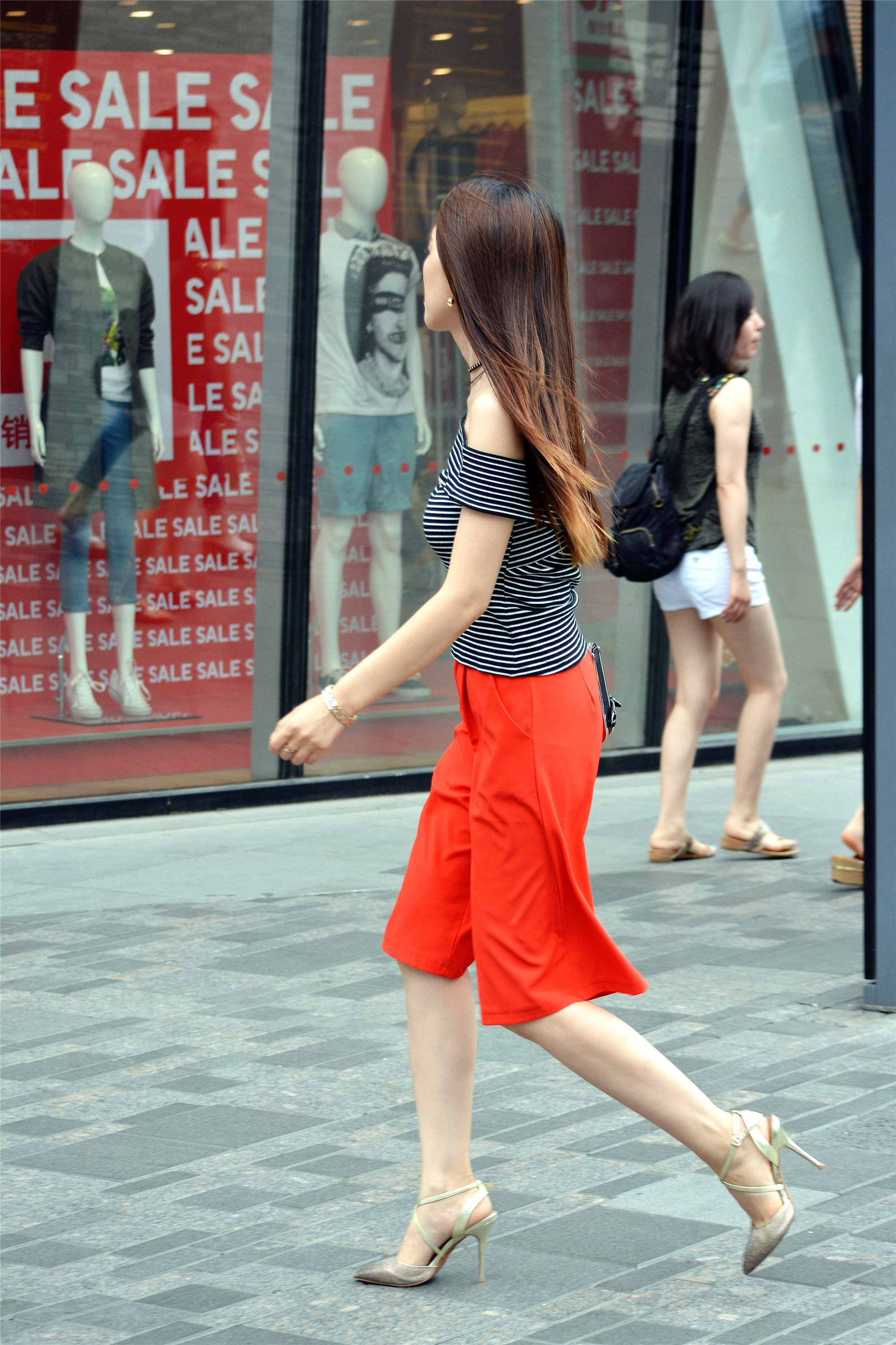 渐变色的尖头细跟凉鞋,细带缠绕在脚面,不仅鞋子很合脚,走路也会很稳,一字肩横纹上衣会显得身材很丰满,一条红色5分短裤,宽松的款式,走路带风的感觉。