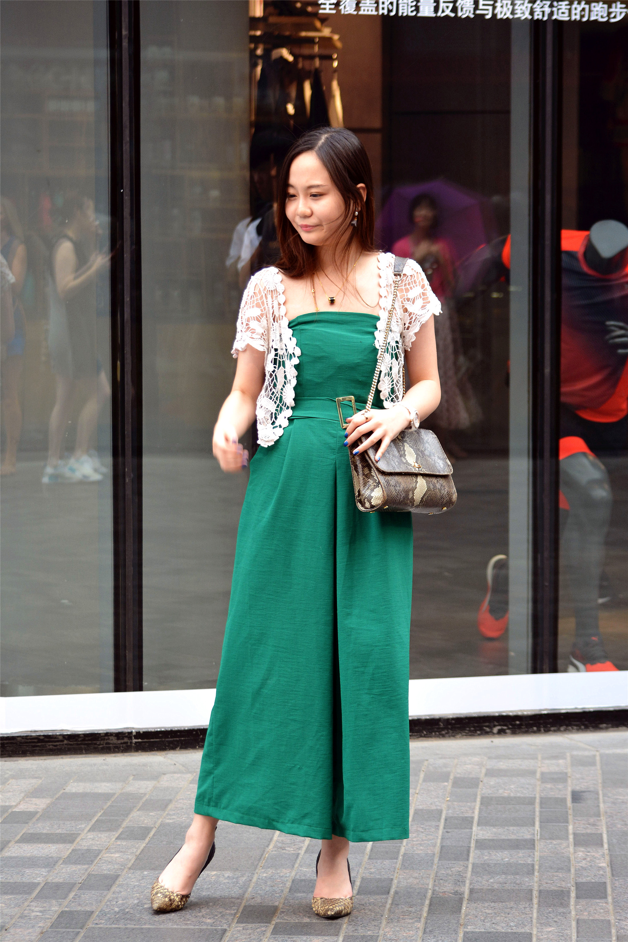 绿色抹胸连衣裤照着一件白色针织镂空小衫,这样搭配显得贵气,宽松的裤腿虽然没有曳地,但是穿一双尖头细跟鞋,也会让你气质提升很多。