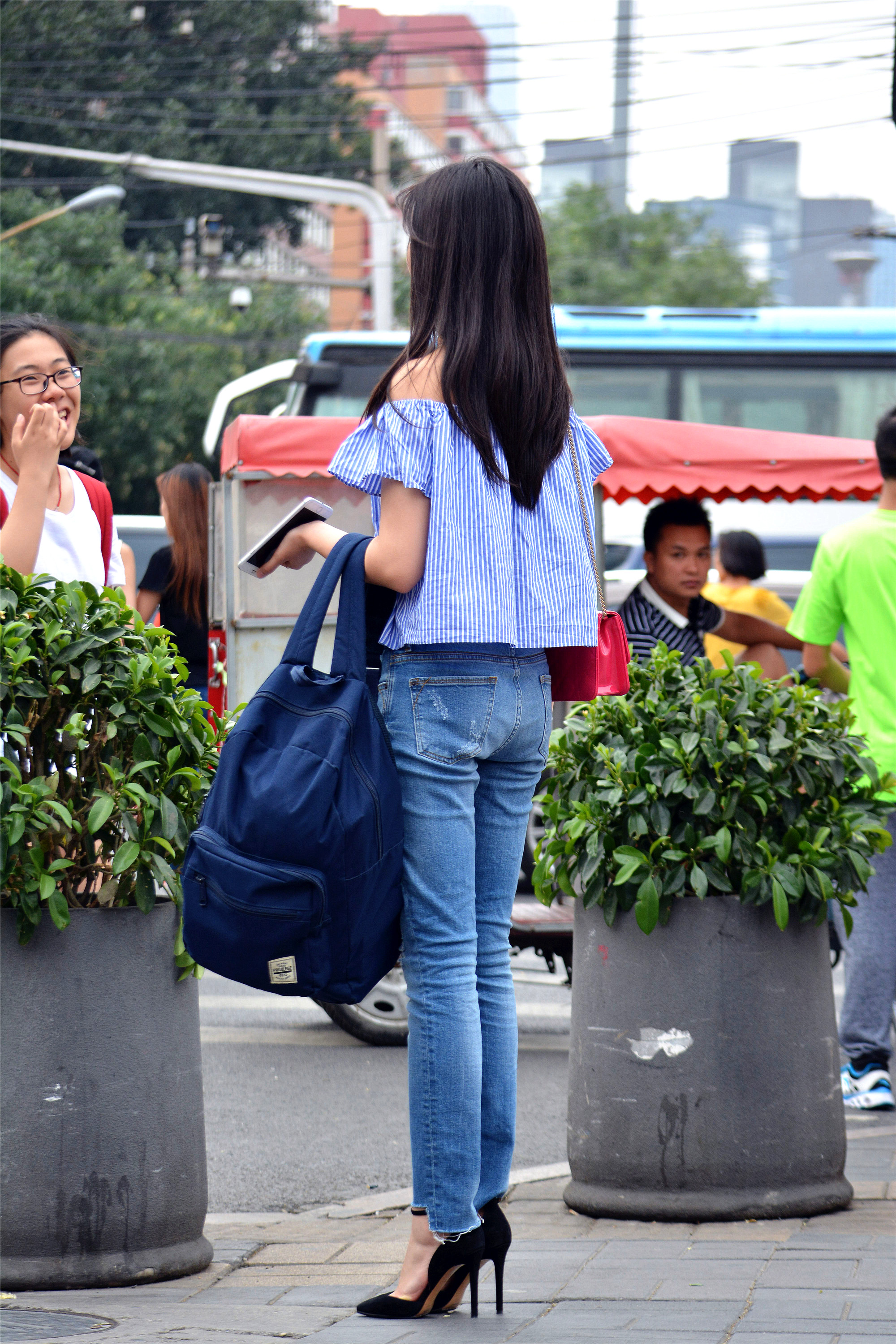 一字带的蓝白相间竖条格小衫,很显身材纤细,而且她穿着薄款牛仔长裤,不是贴身的弹力牛仔,却很好的展示她笔直纤细的长腿,那一双黑色绒面尖头细跟凉鞋,却更显出她身材的比例感来。