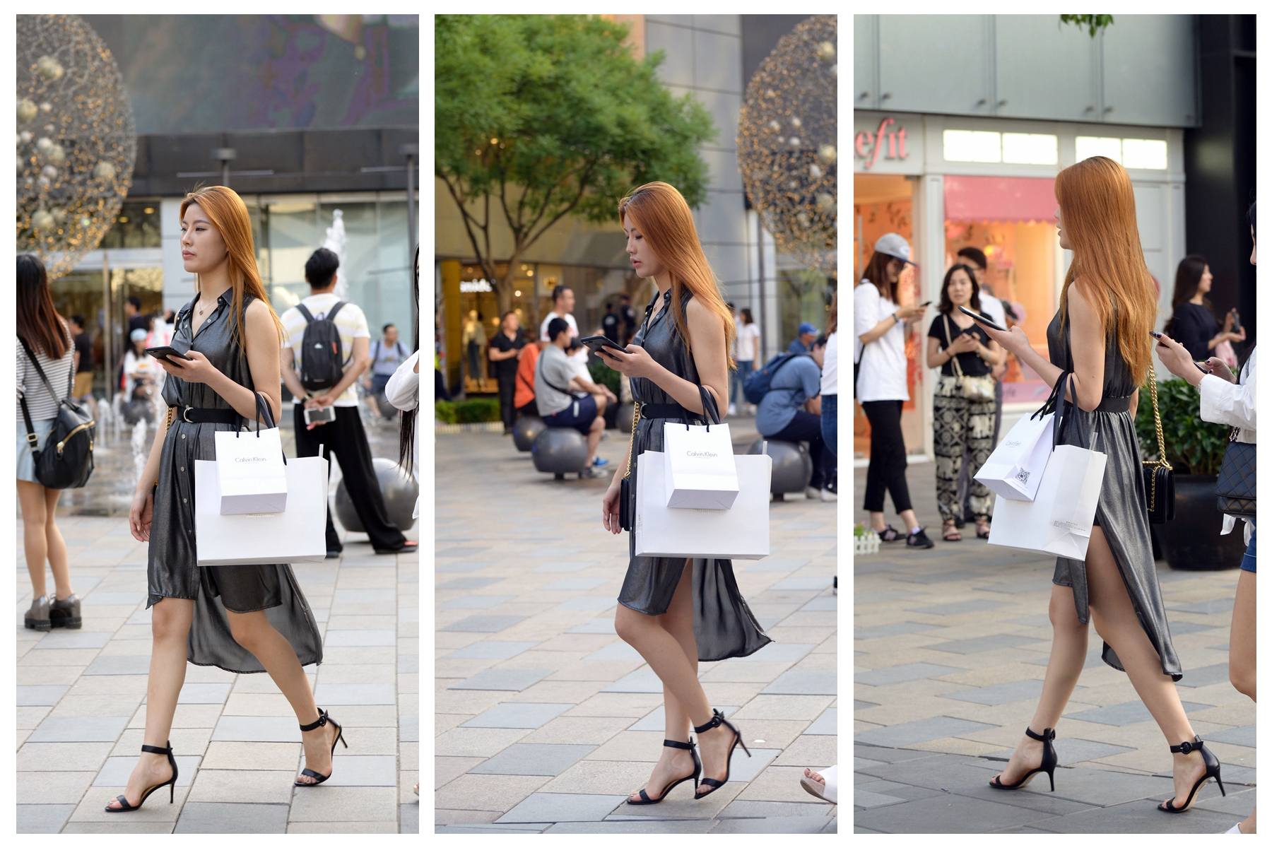 连衣裙是属于春夏秋的服装,就一件简单的连衣裙,搭配出时尚感来,不仅仅是需要身材好的问题,也要选对款式和色彩,还有时尚感觉,很多时尚的姑娘都会有穿连衣裙逛街的时候,但是真正给人留下印象深刻的却不多,在这里一天可能会有很多穿连衣裙的姑娘,而唯独这位小姐姐的搭配让你眼前一亮,浅灰的色彩,带着半透效果,阳光下又会有着一点镭射风格,带着十足的未来感觉,前后的错襟更是增加层次感和立体效果,腰间选择一条黑色腰带来装饰,也可以看出漂亮的腰线,让身材比例更好。