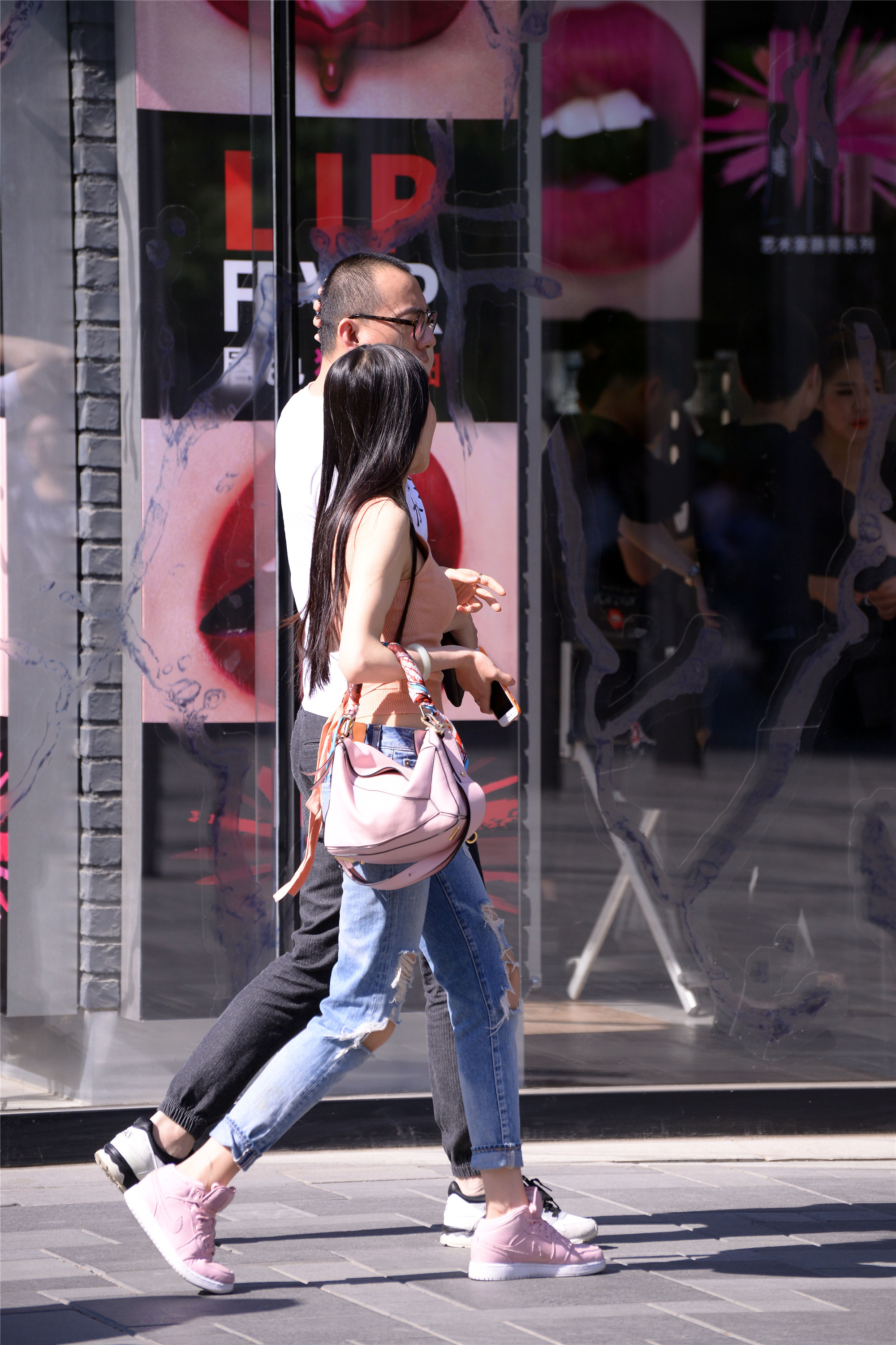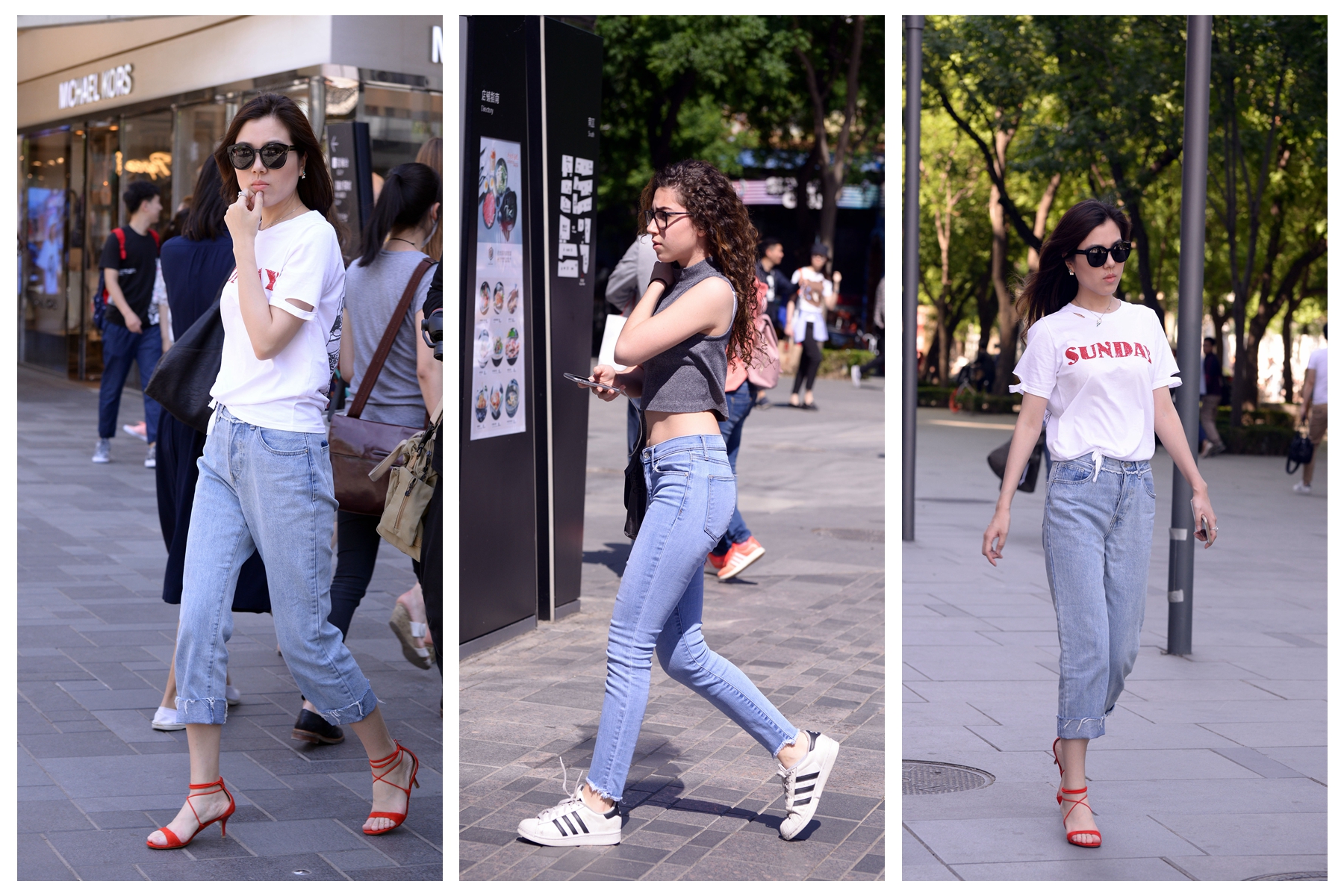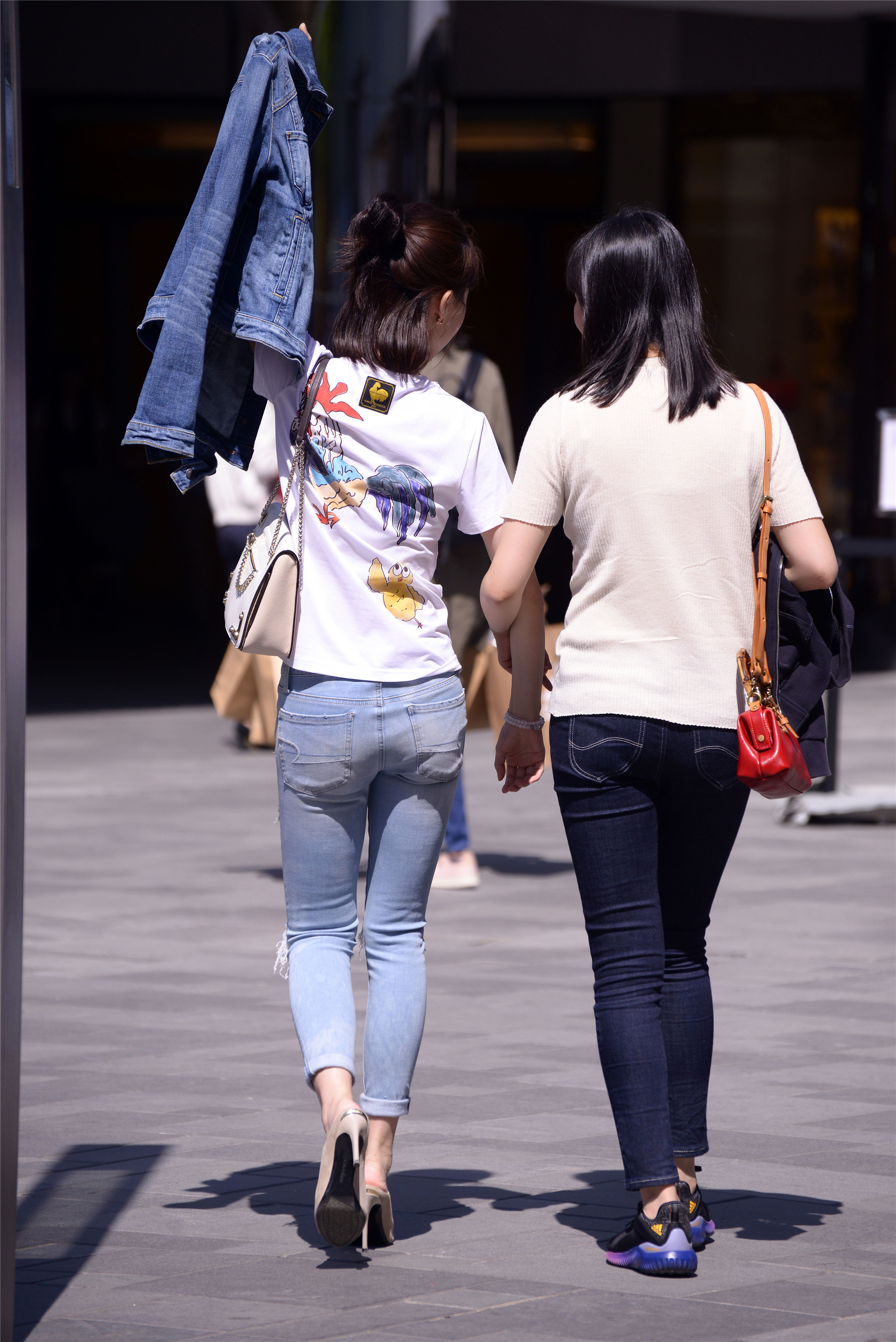 在这里逛街的大部分都是普通人,她们因为工作关系和周围的环境,她们要把自己打扮的漂亮一点,才慢慢的学会搭配,即使是简单的牛仔裤和T恤,搭配出来的感觉也会有着自己的时尚感,破洞牛仔一般在大城市里面穿的人多,也能够搭配出自己的特色来。