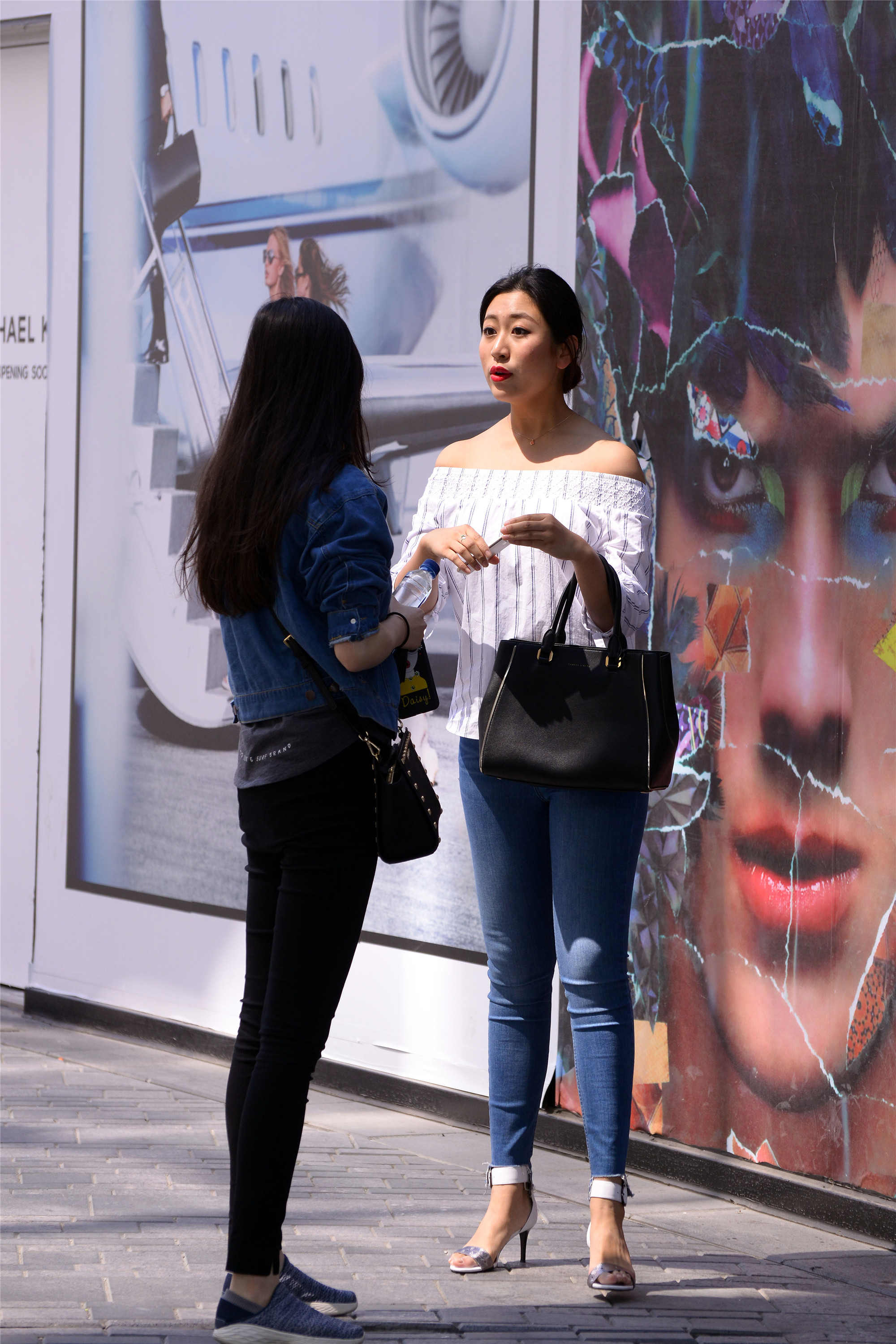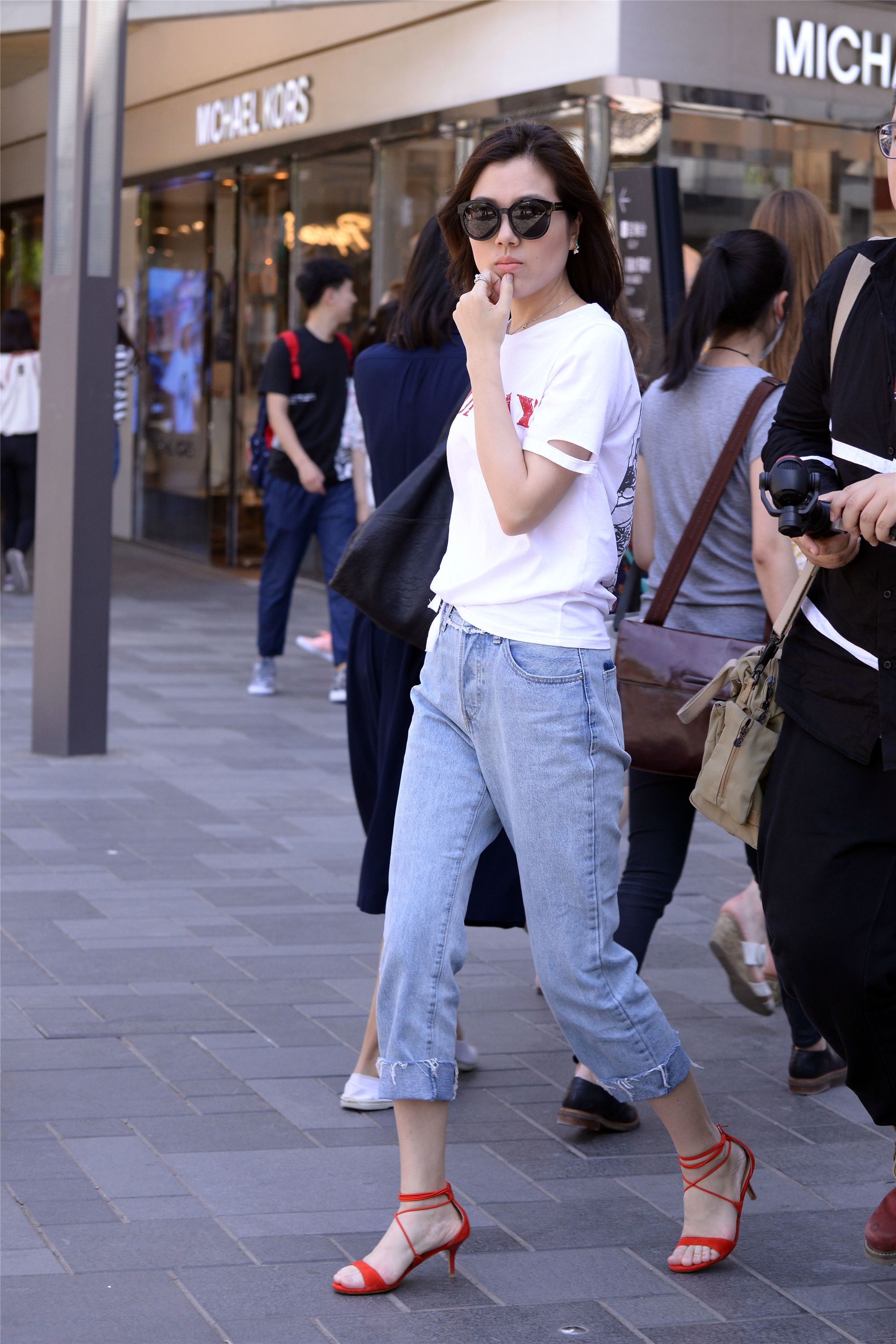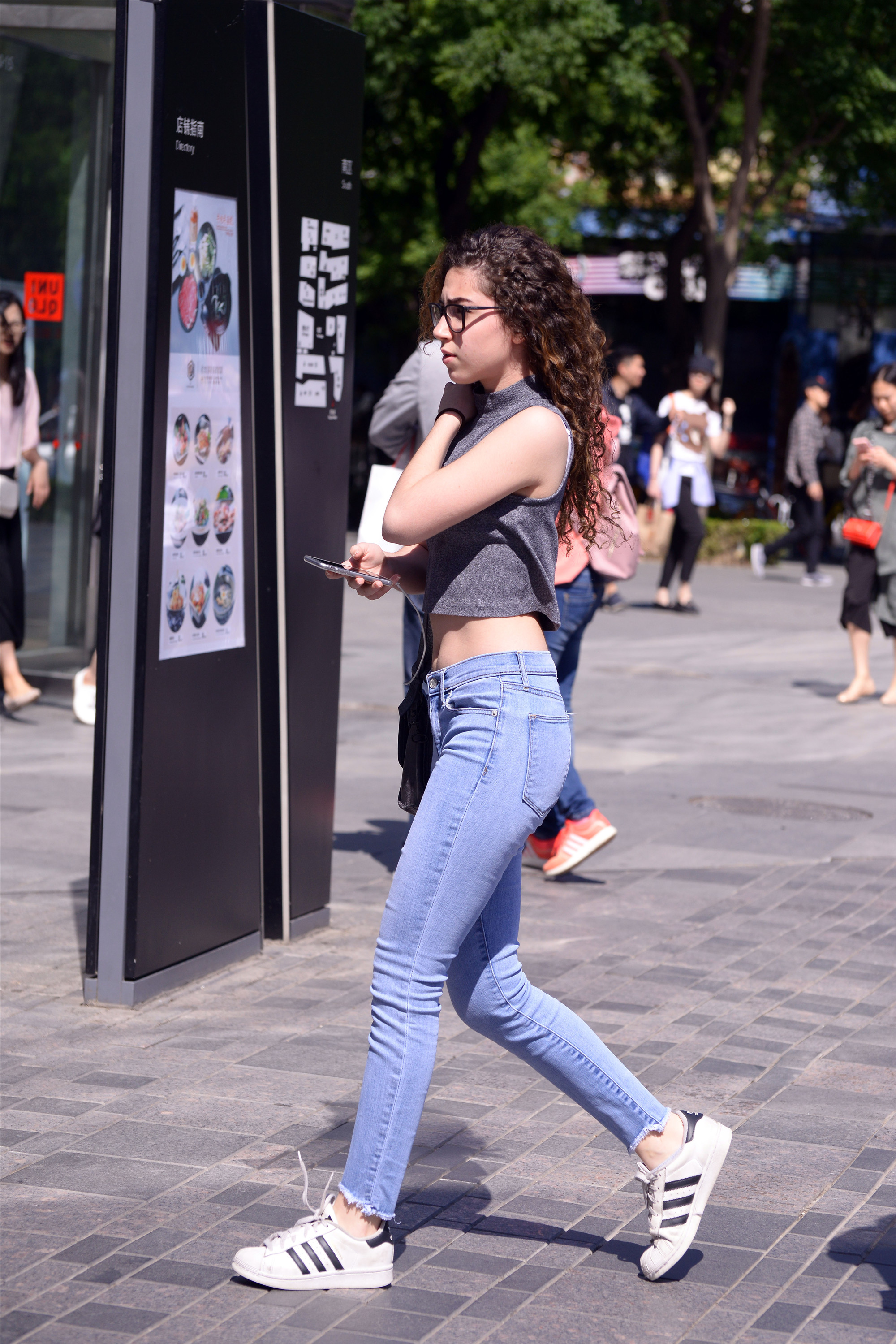 在这里逛街的大部分都是普通人,她们因为工作关系和周围的环境,她们要把自己打扮的漂亮一点,才慢慢的学会搭配,即使是简单的牛仔裤和T恤,搭配出来的感觉也会有着自己的时尚感,破洞牛仔一般在大城市里面穿的人多,也能够搭配出自己的特色来。