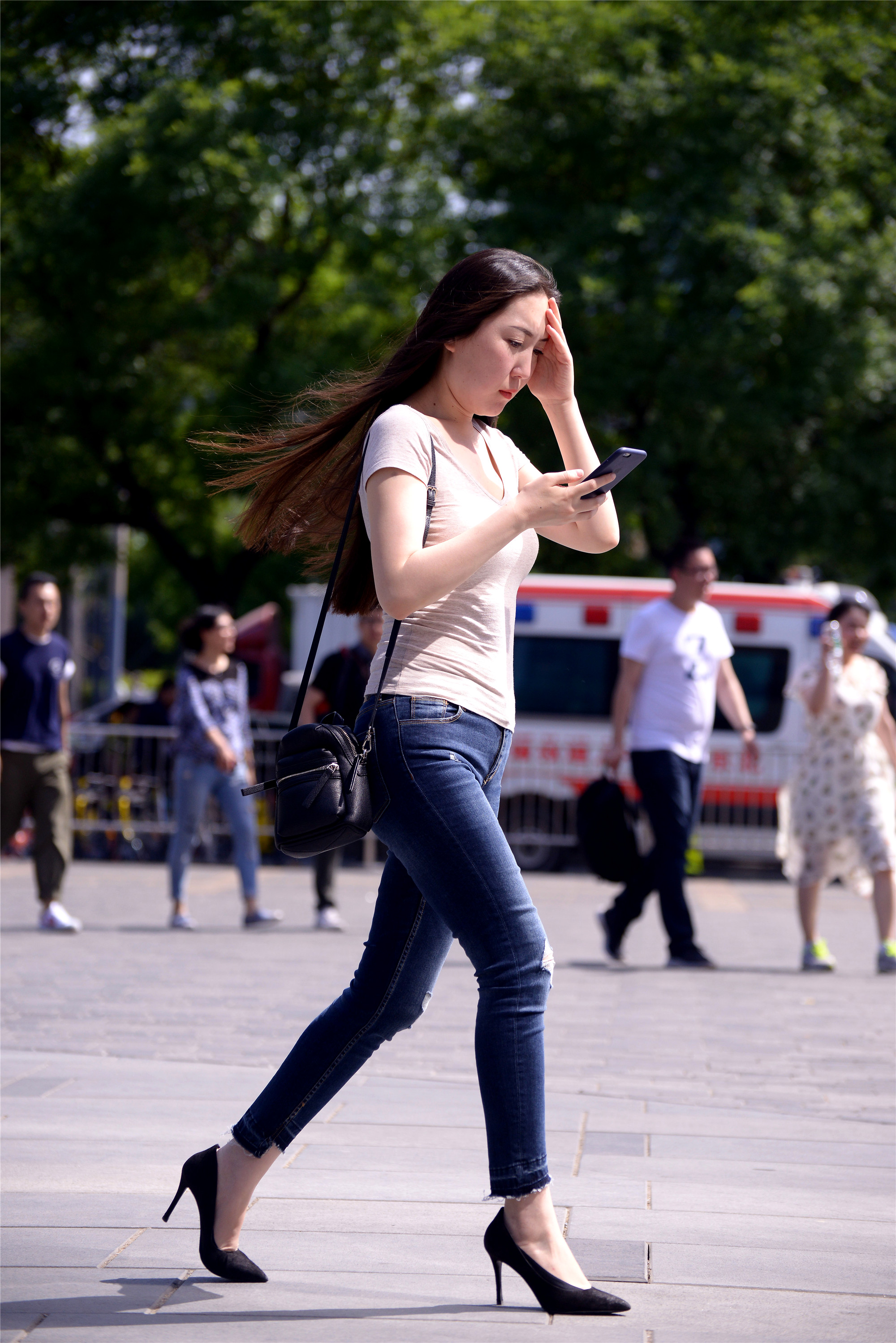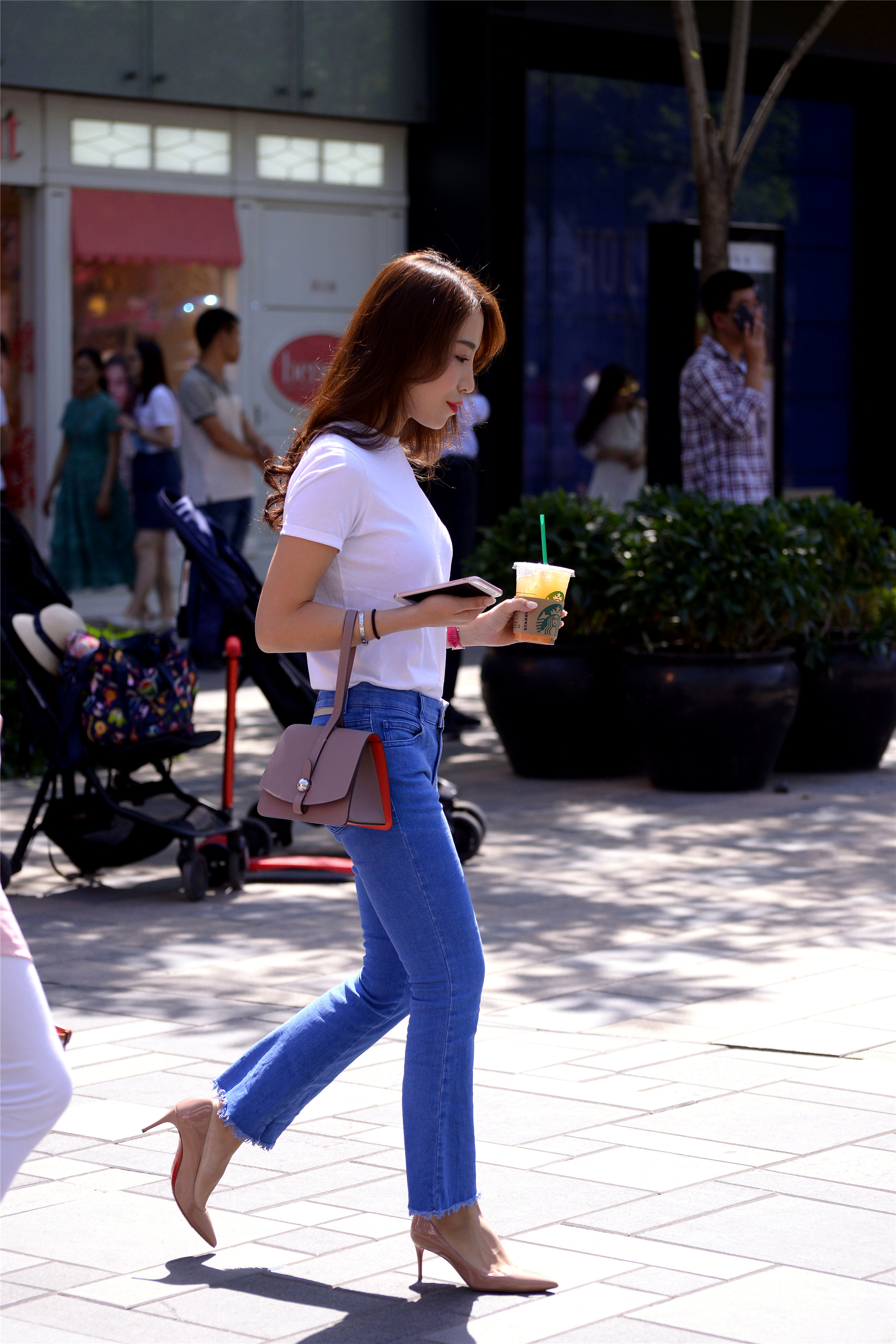 这位姐姐这款牛仔裤,蓝色非常通透,搭配一件白色半袖,色彩上非常漂亮,一杯咖啡拿在手里,这样轻松自如的驾驭一双裸色尖头细跟鞋,看着就非常美的感觉。