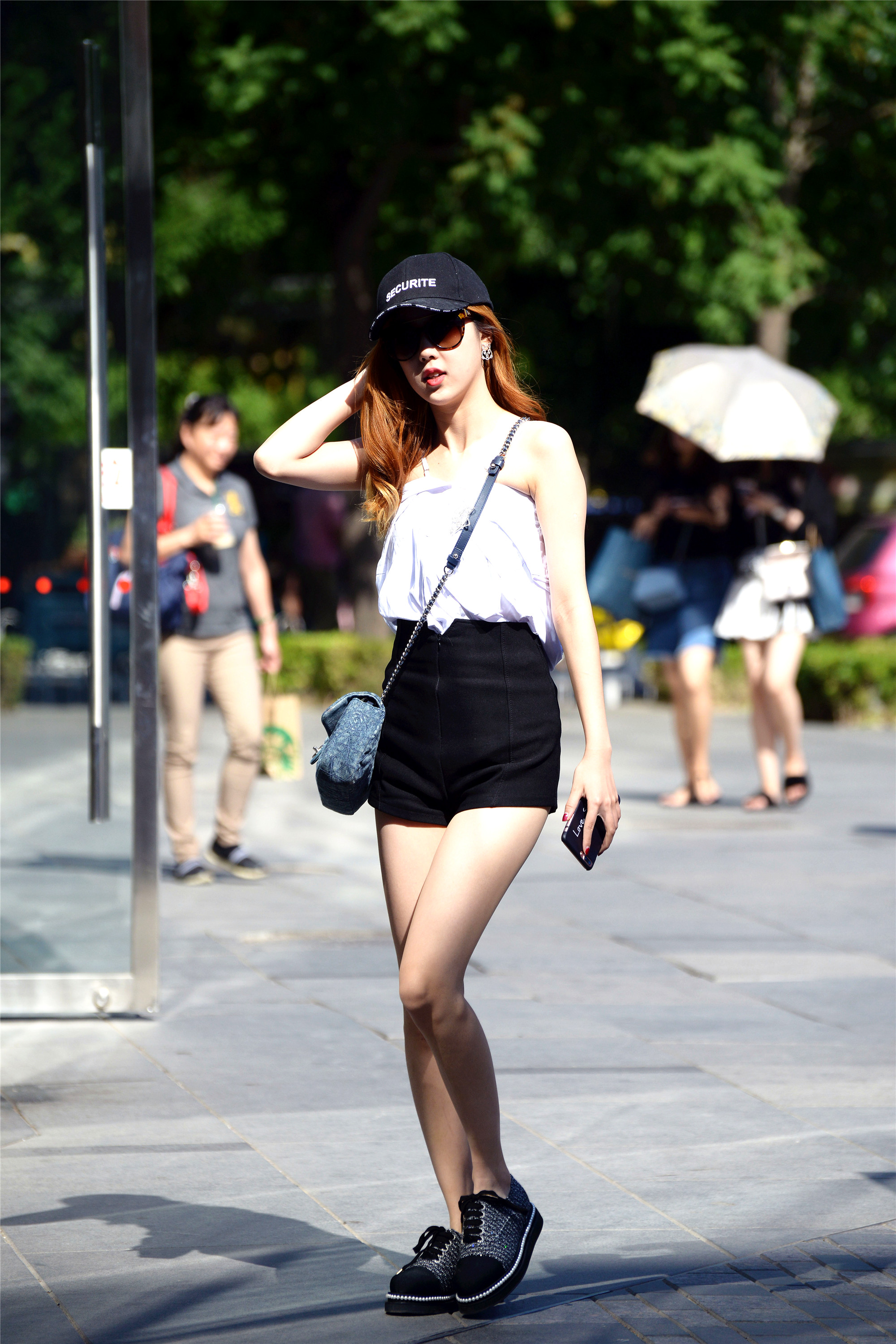 无袖背心搭配牛仔短裤,特别是一双平底鞋和鸭舌帽,这样的运动风格十足,而且看姑娘走路时候腿部的肌肉就会让你知道,她一定是位爱健身、爱运动的女孩。