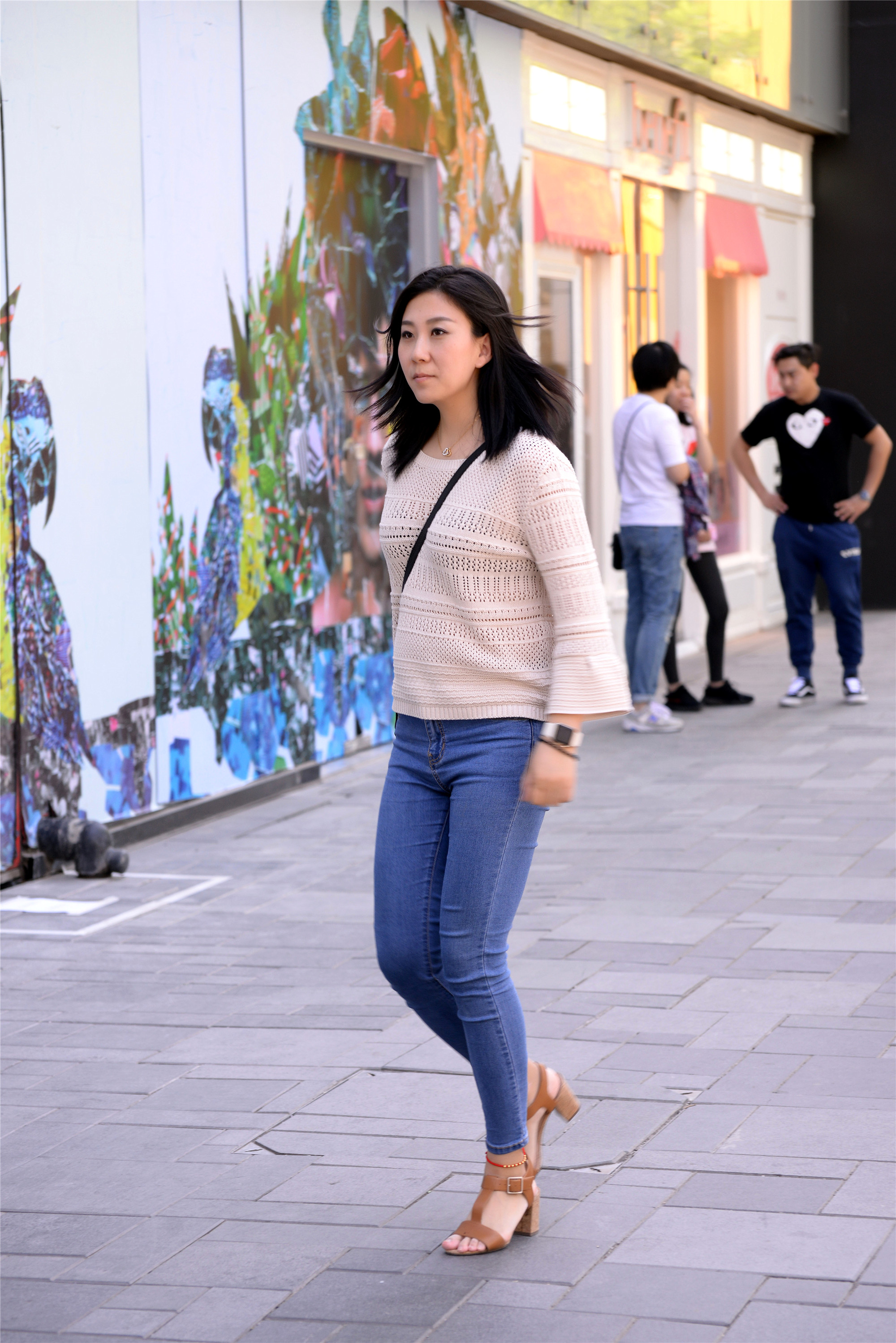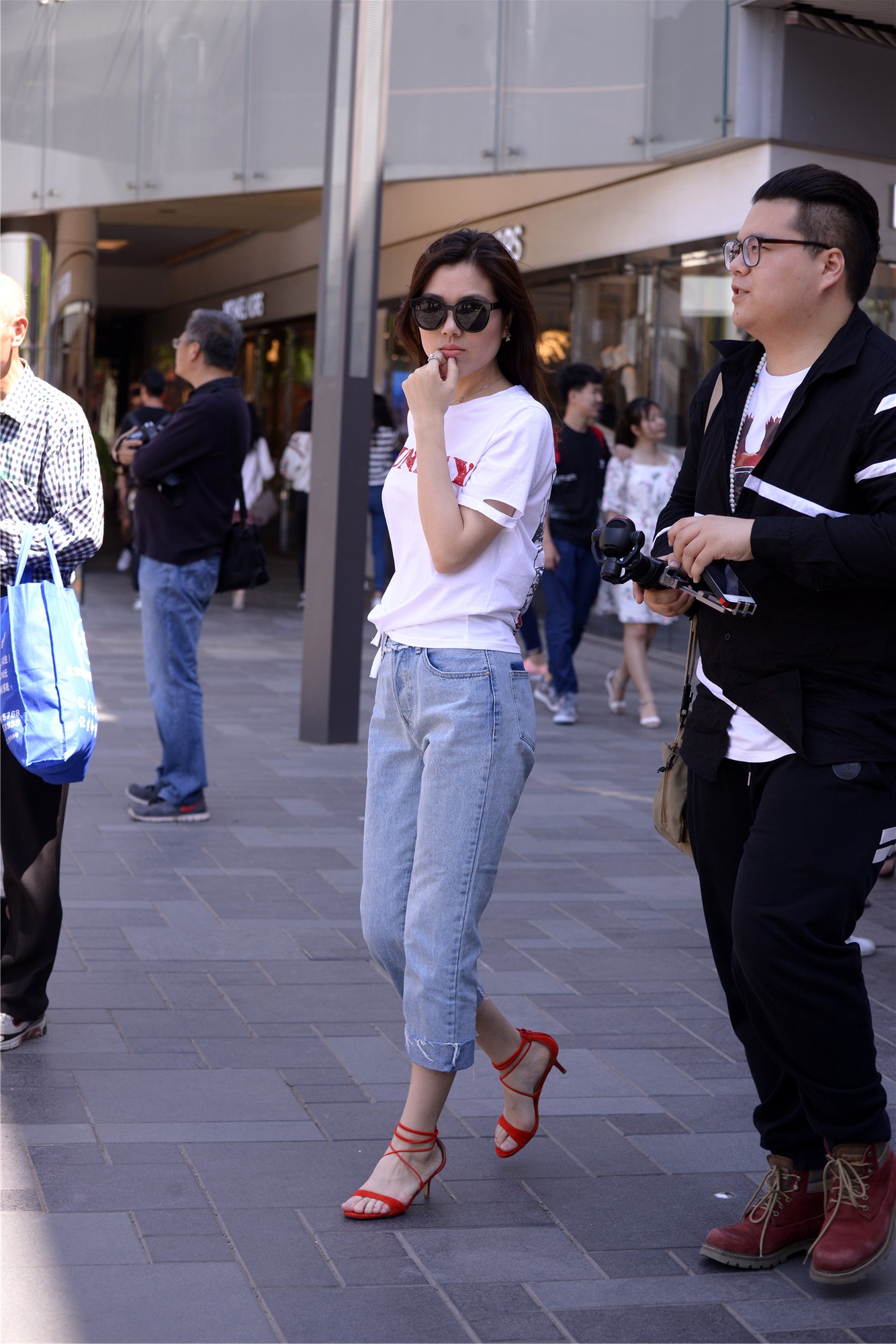 白色半袖搭配牛仔长裤,裤脚挽起,就成了九分长度,这样能够更好的展示脚踝和高跟鞋