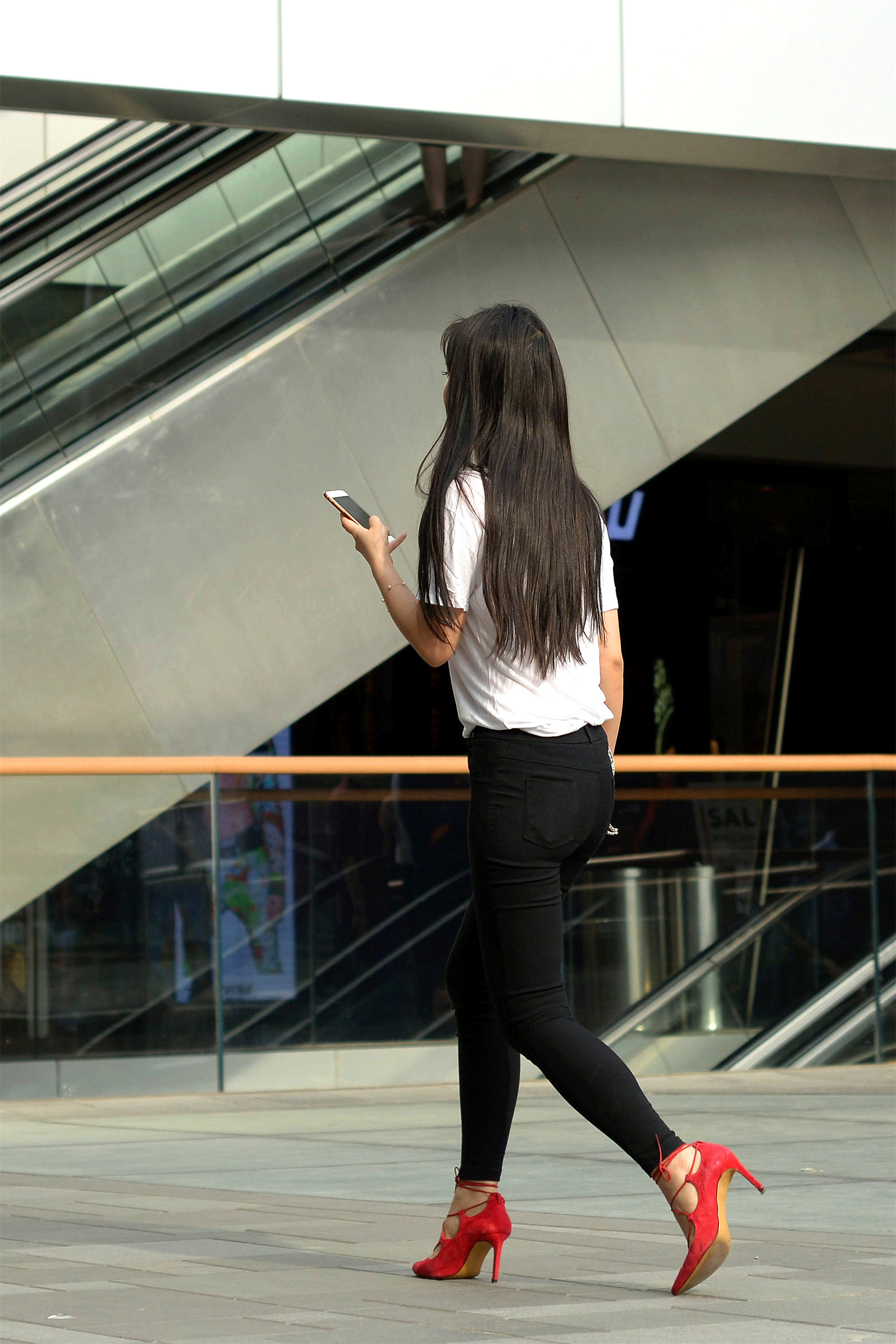 这位小姐姐,以前经常来,现在却看不见她了,身材高挑的她天生就是衣服架子,她的牛仔裤是宽松的款式,但是却用一双高跟鞋撑起来,这双尖头细跟鞋要10公分左右,却被牛仔裤遮挡住了。