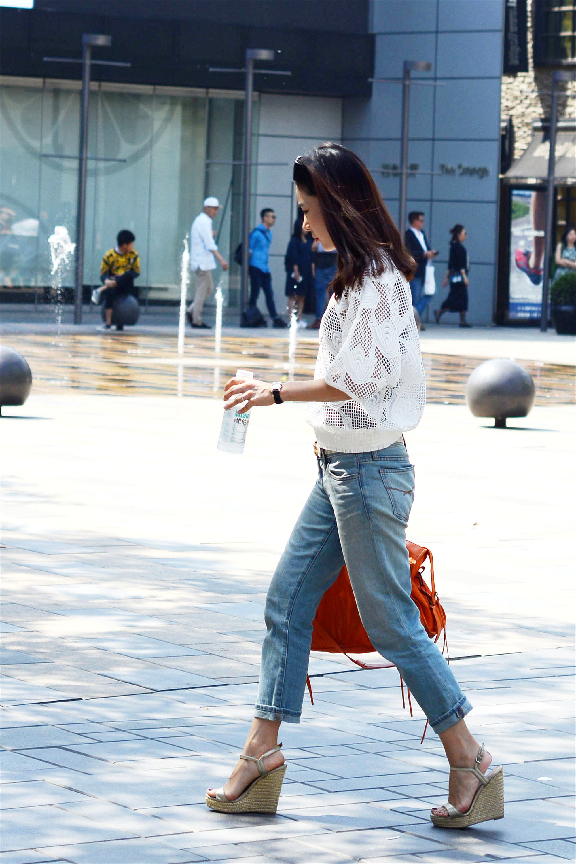 白色镂空半袖,搭配一条水洗蓝色牛仔裤,九分长度,更有着七分的感觉,以上坡跟鞋,身材会显得高挑而稳重,走路也方便自然。