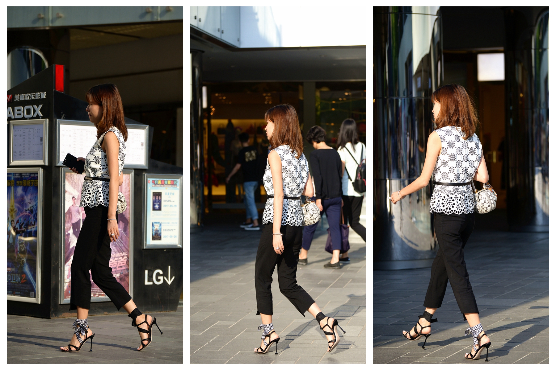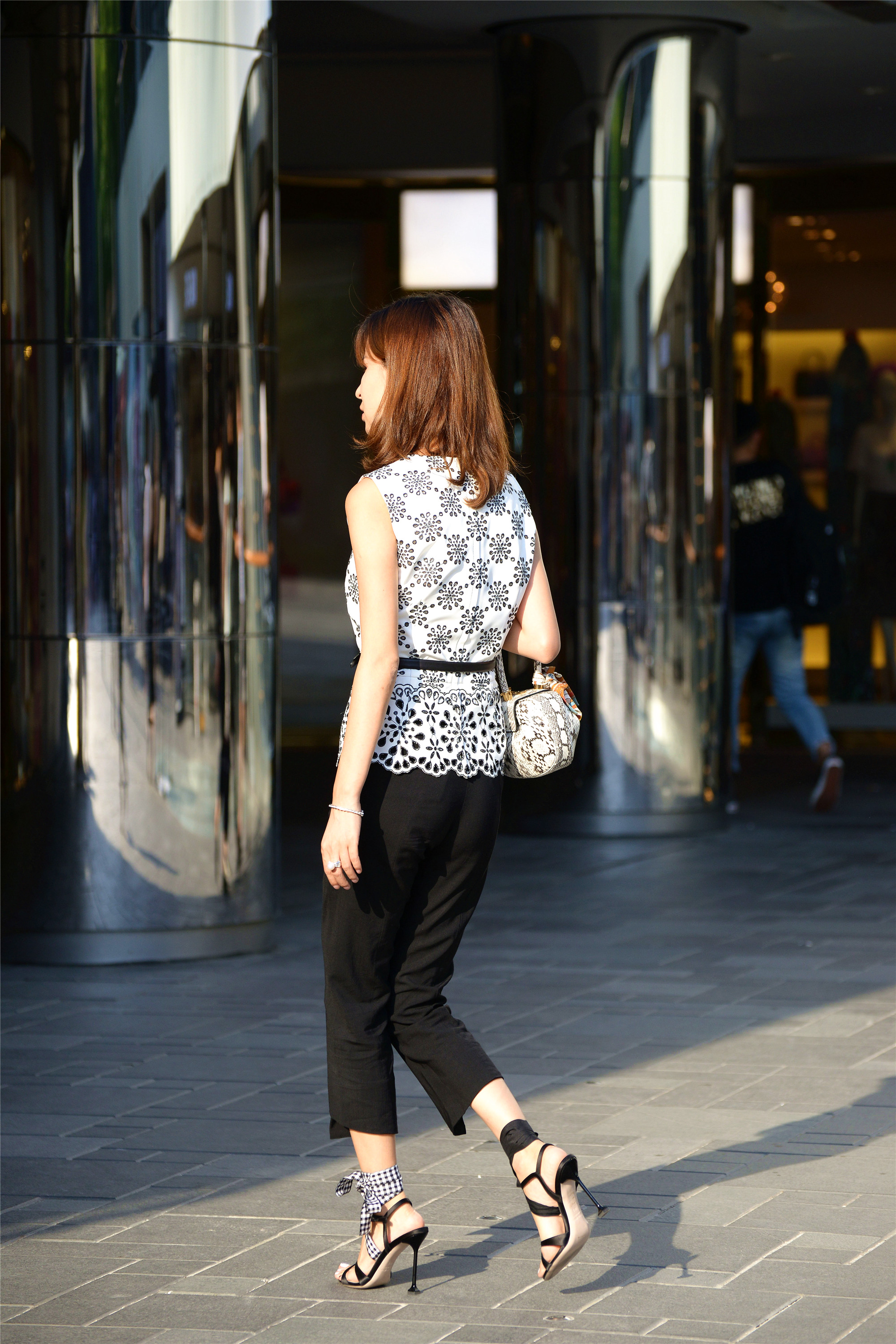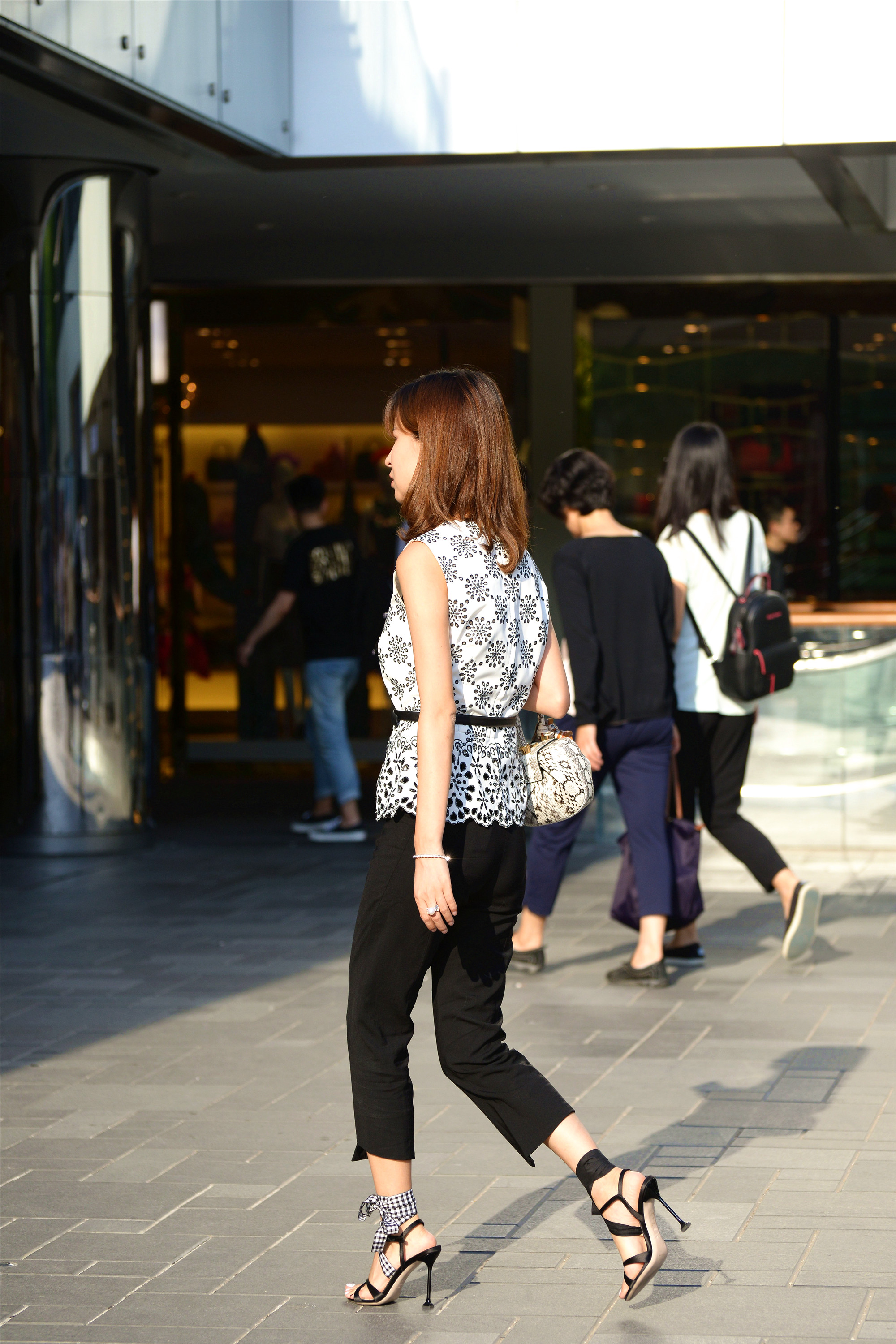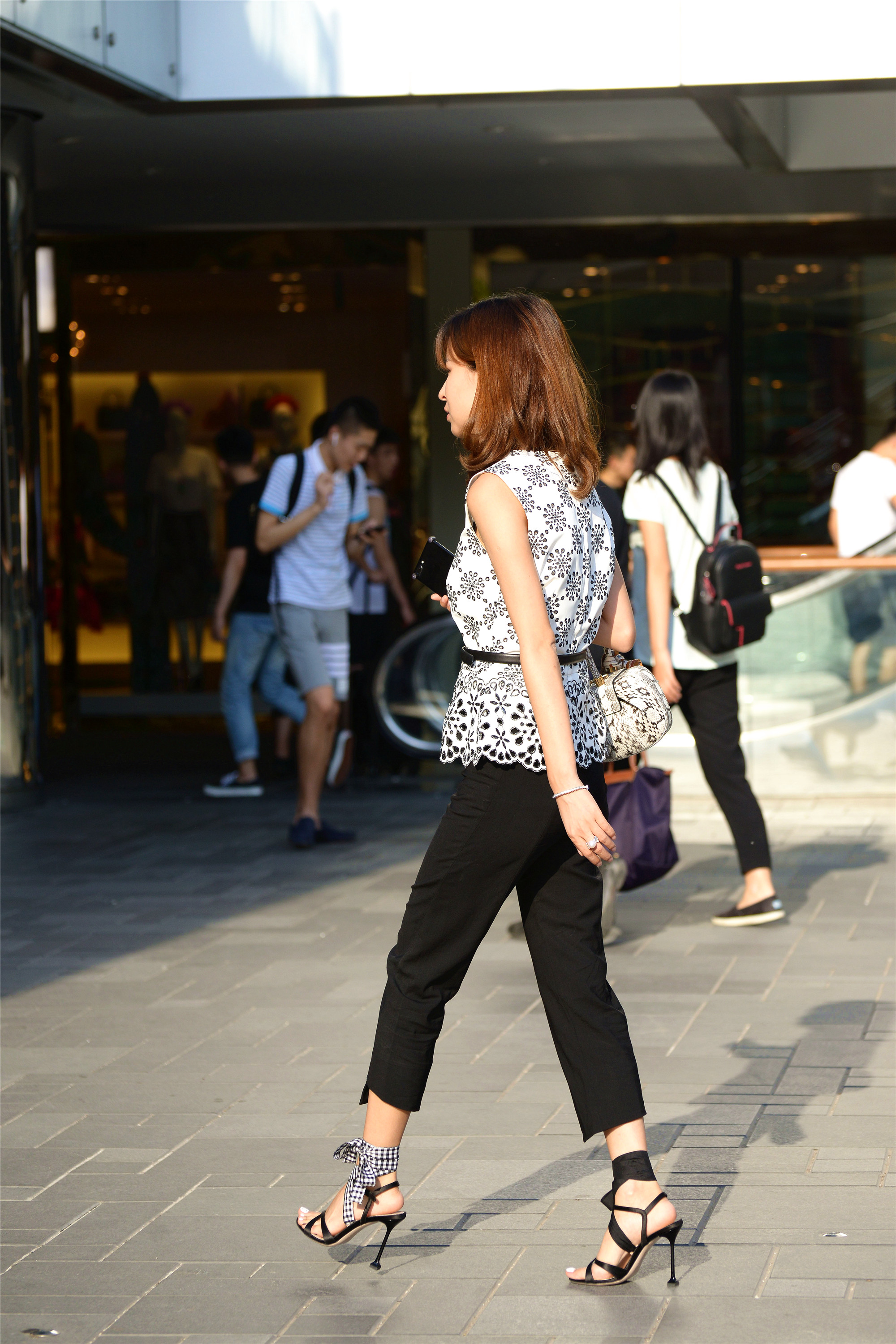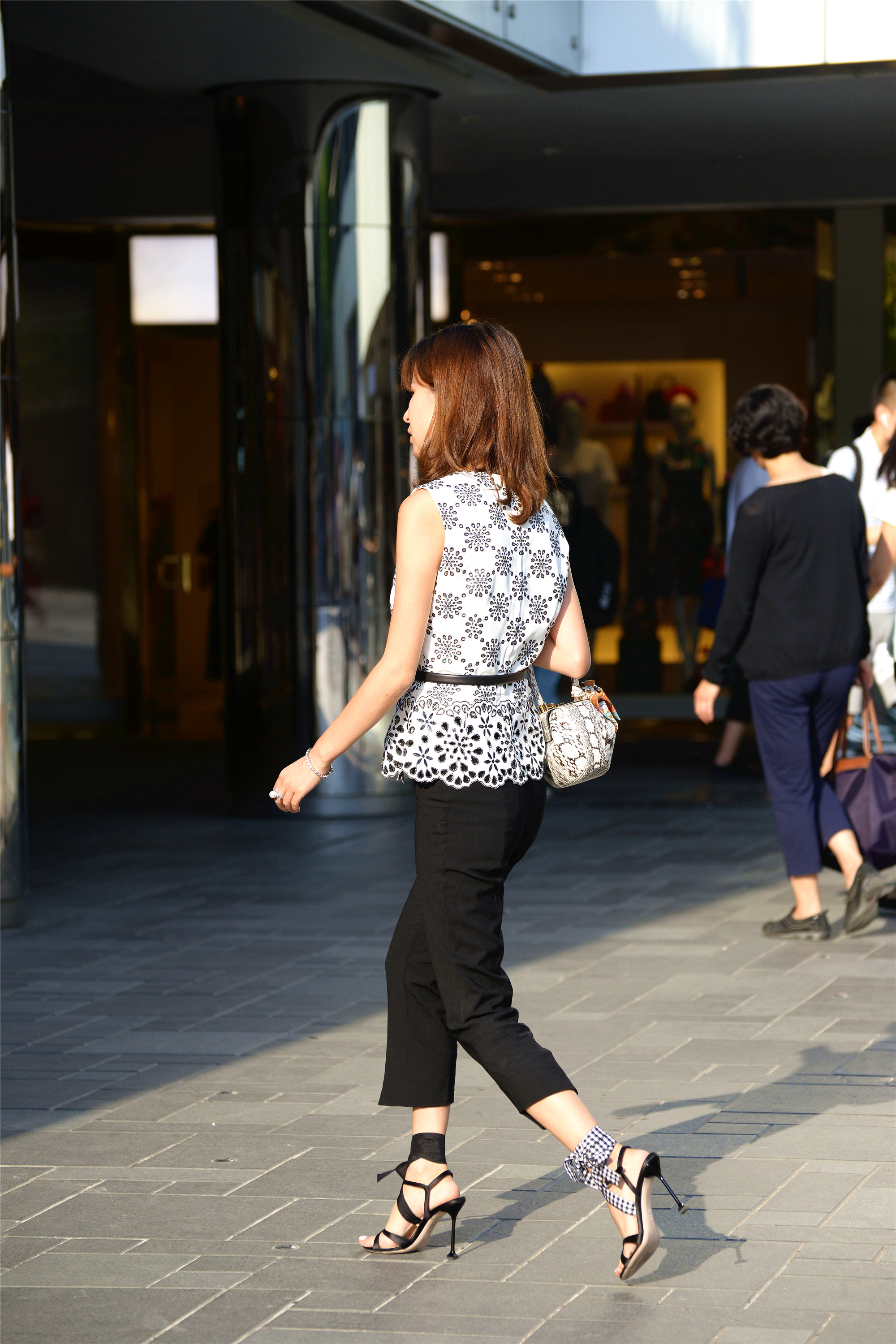 当然,高跟鞋是她展示自己的一部分,其实姐姐的搭配也是很时尚的,一件白底的半袖,水滴状的花纹点缀在上面,一条黑色的腰带,更好的展示腰线部分,黑色的七分裤,更显出一种洒脱的感觉,也更能展示她脚下鞋子的漂亮,这样的搭配不仅仅是增高10公分那么简单