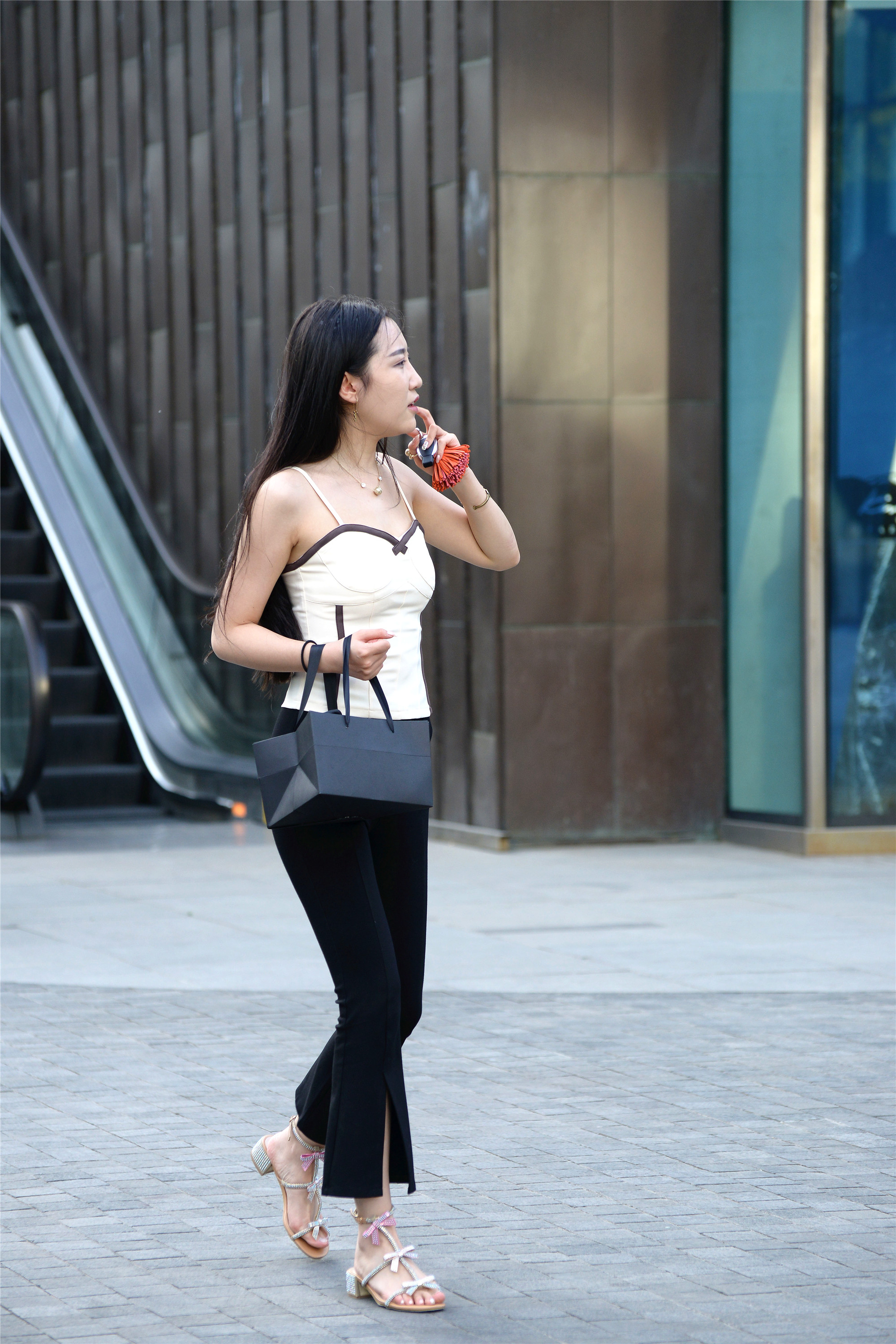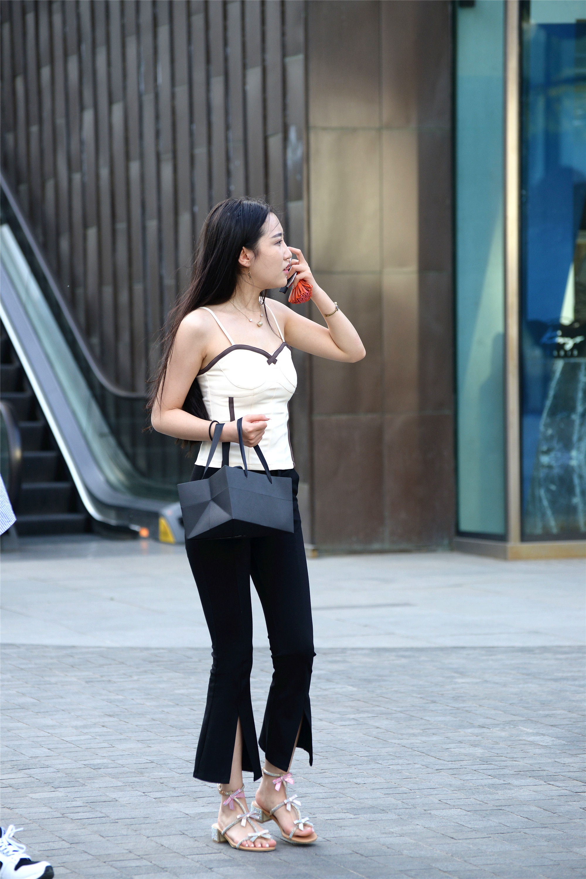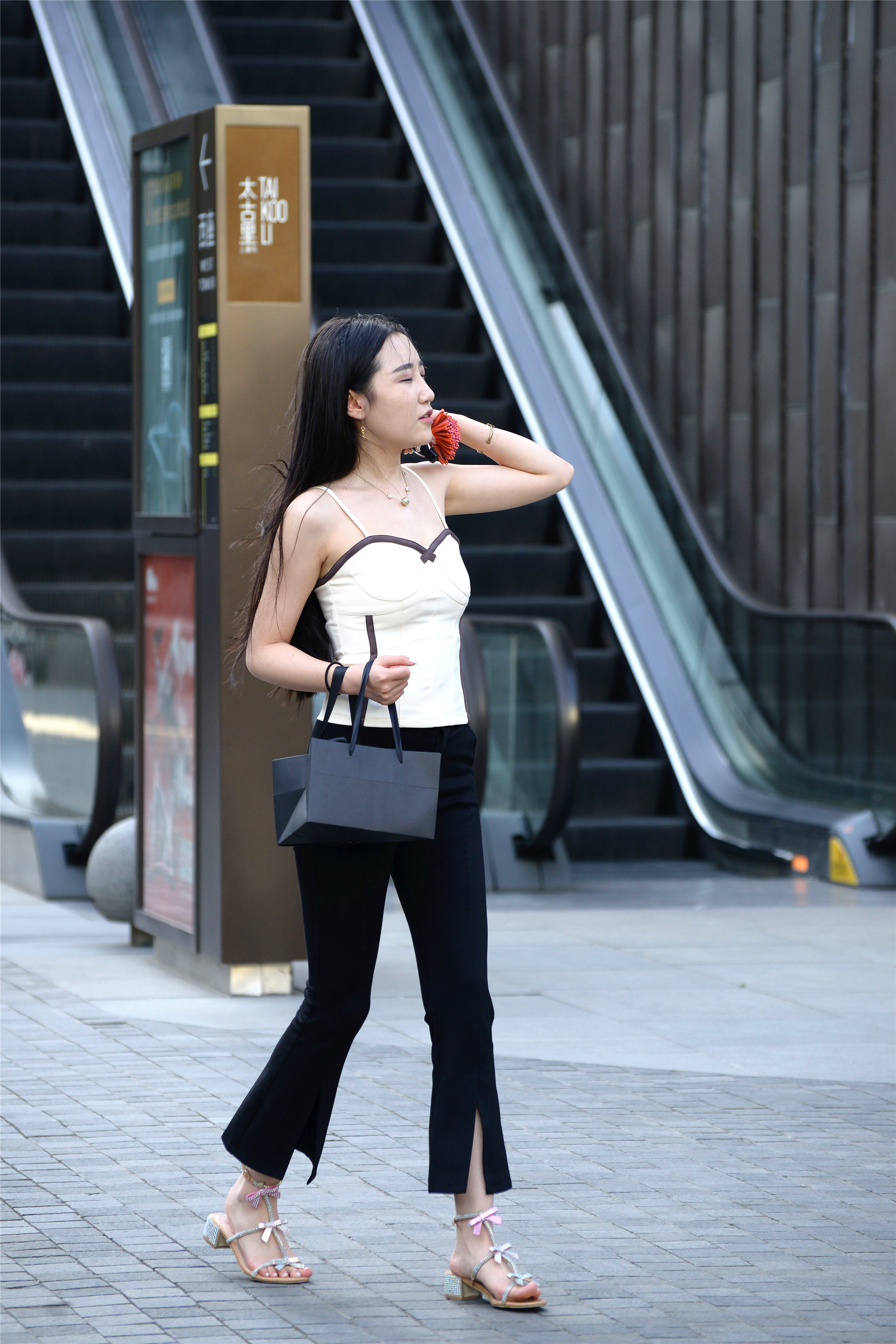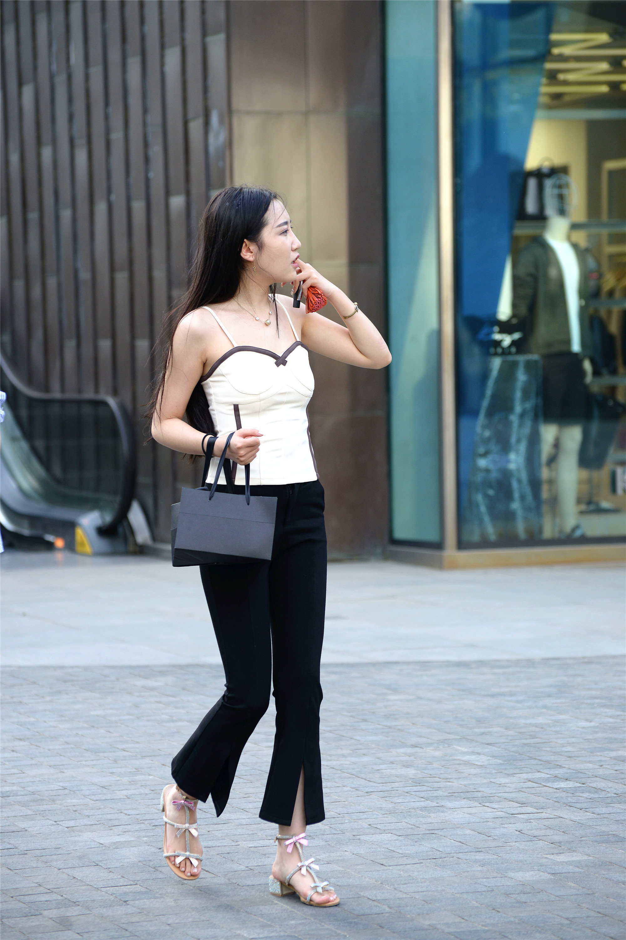 黑色高腰九分裤要靠着白色吊带来衬托,才可以这么彰显身材