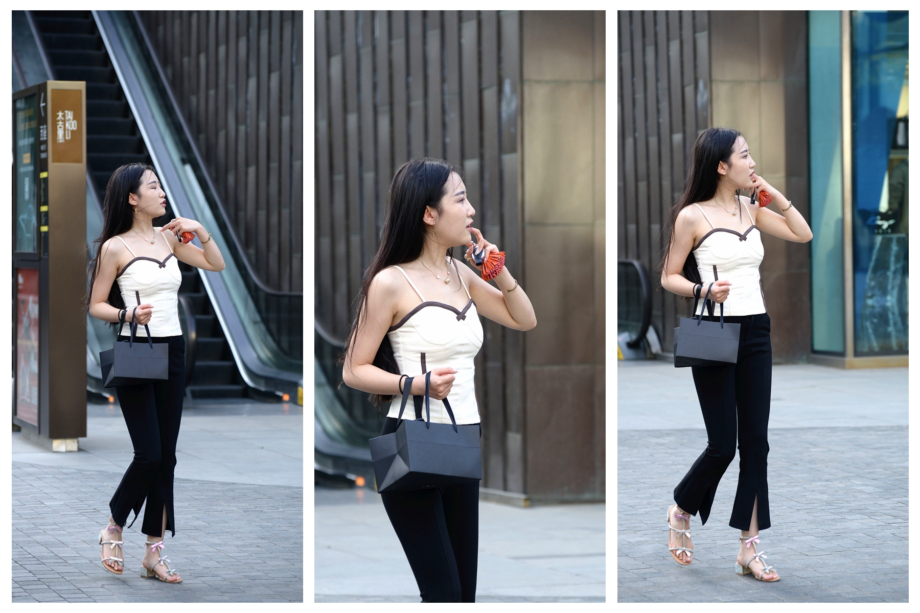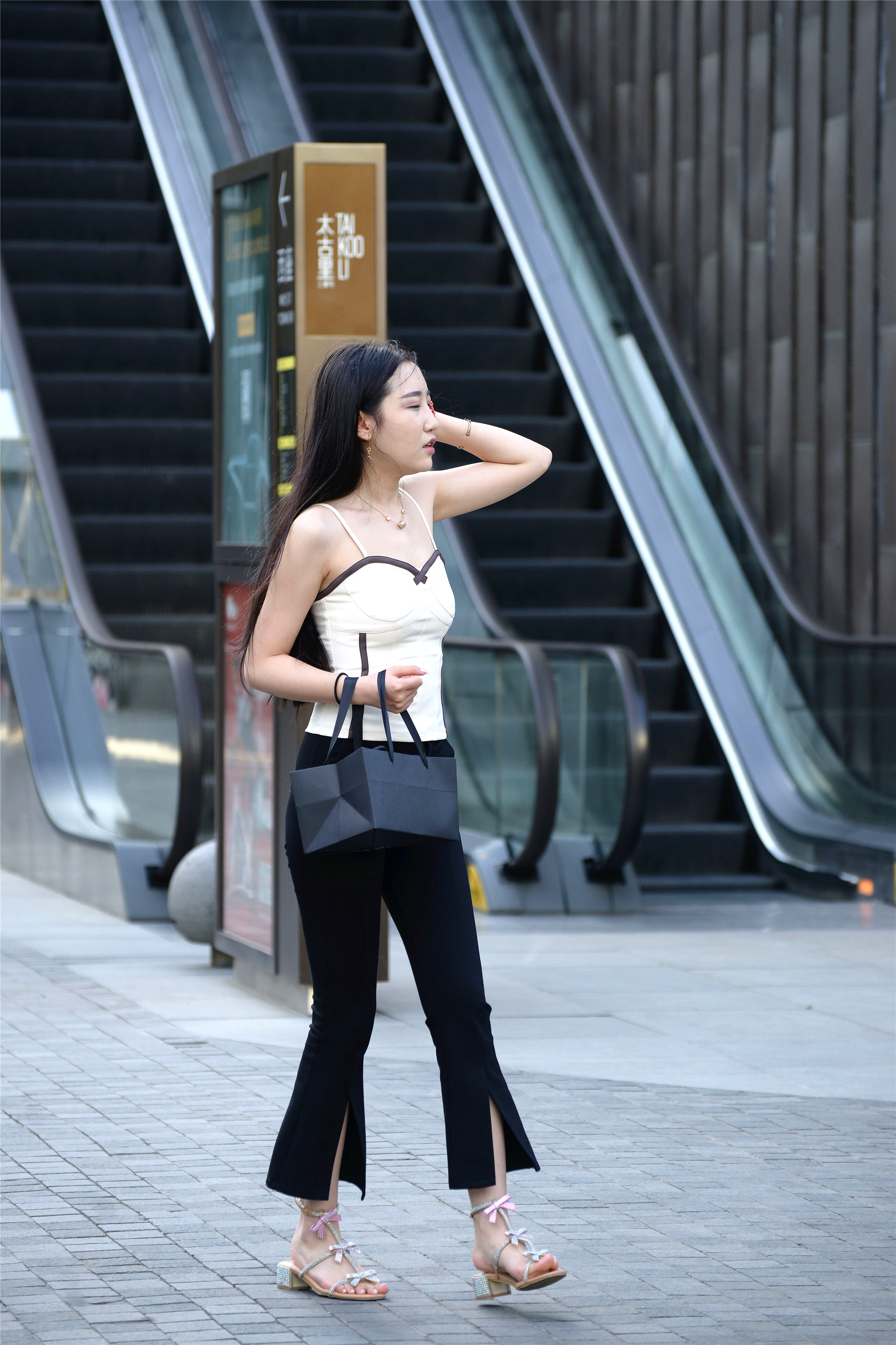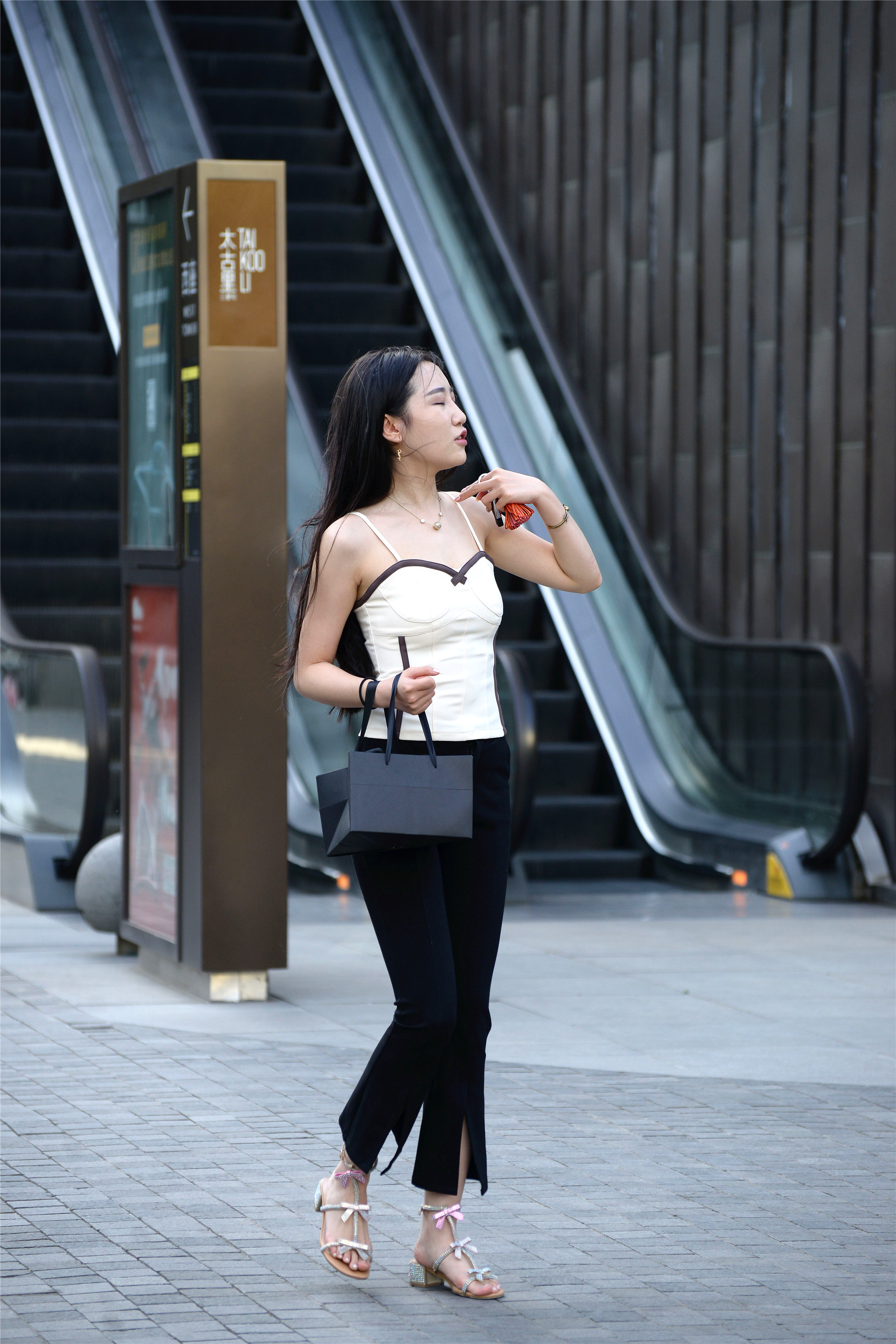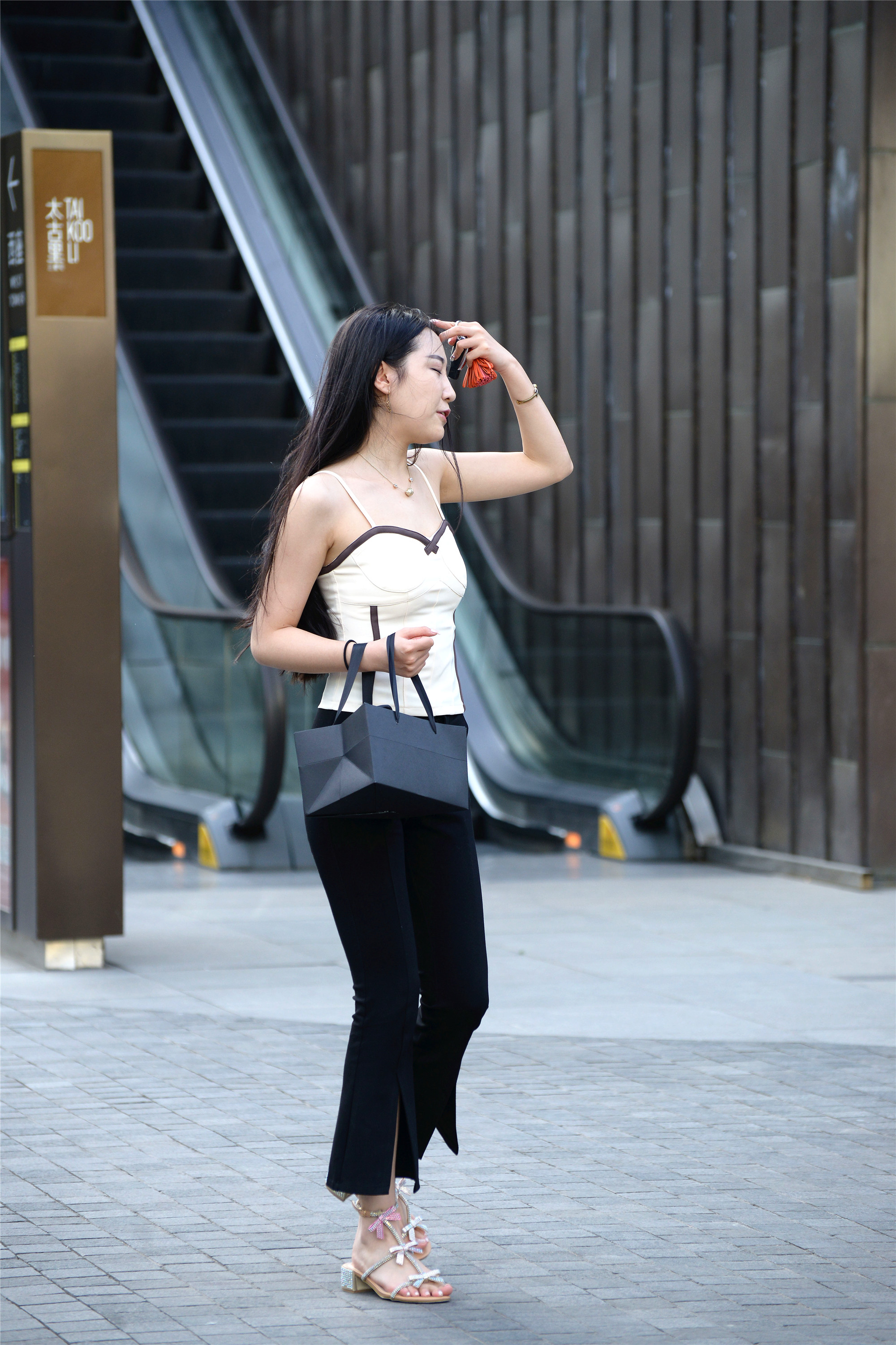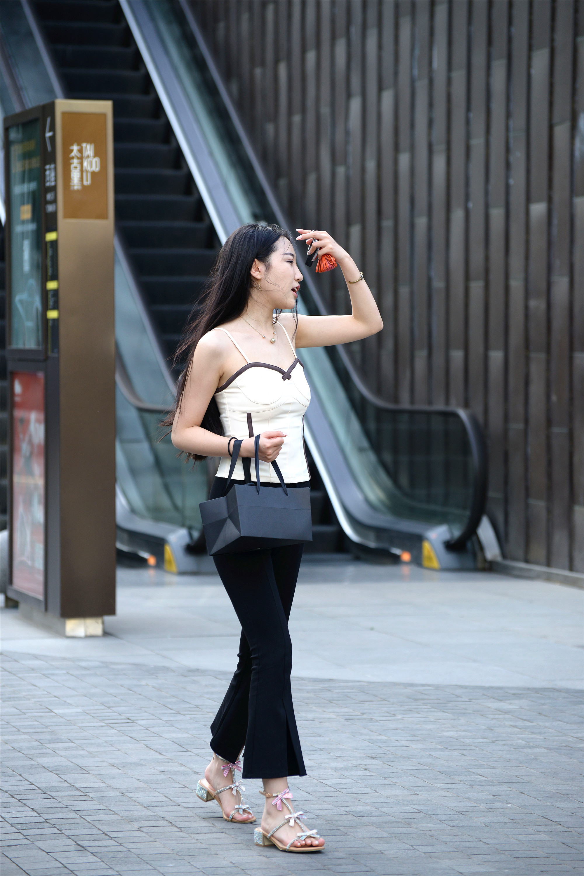 黑色高腰九分裤要靠着白色吊带来衬托,才可以这么彰显身材