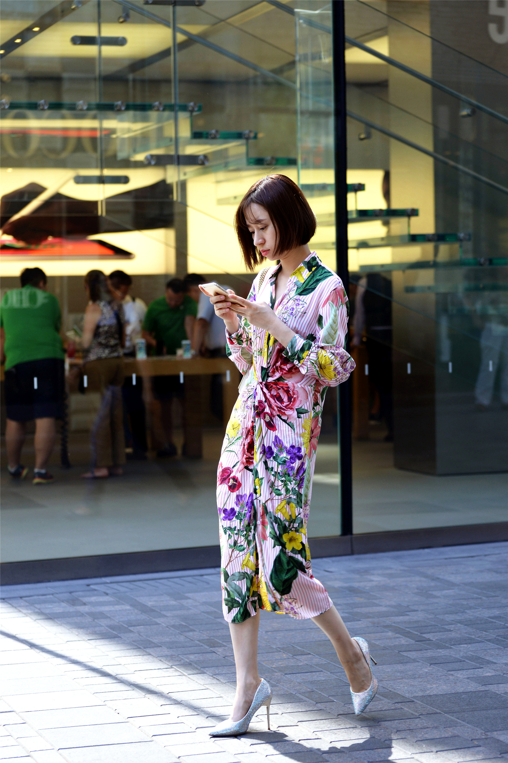 小姐姐这一件多色印花连衣裙有点睡衣的感觉,脚下一双镭射感觉的尖头细跟鞋,非常有时尚感和未来感。