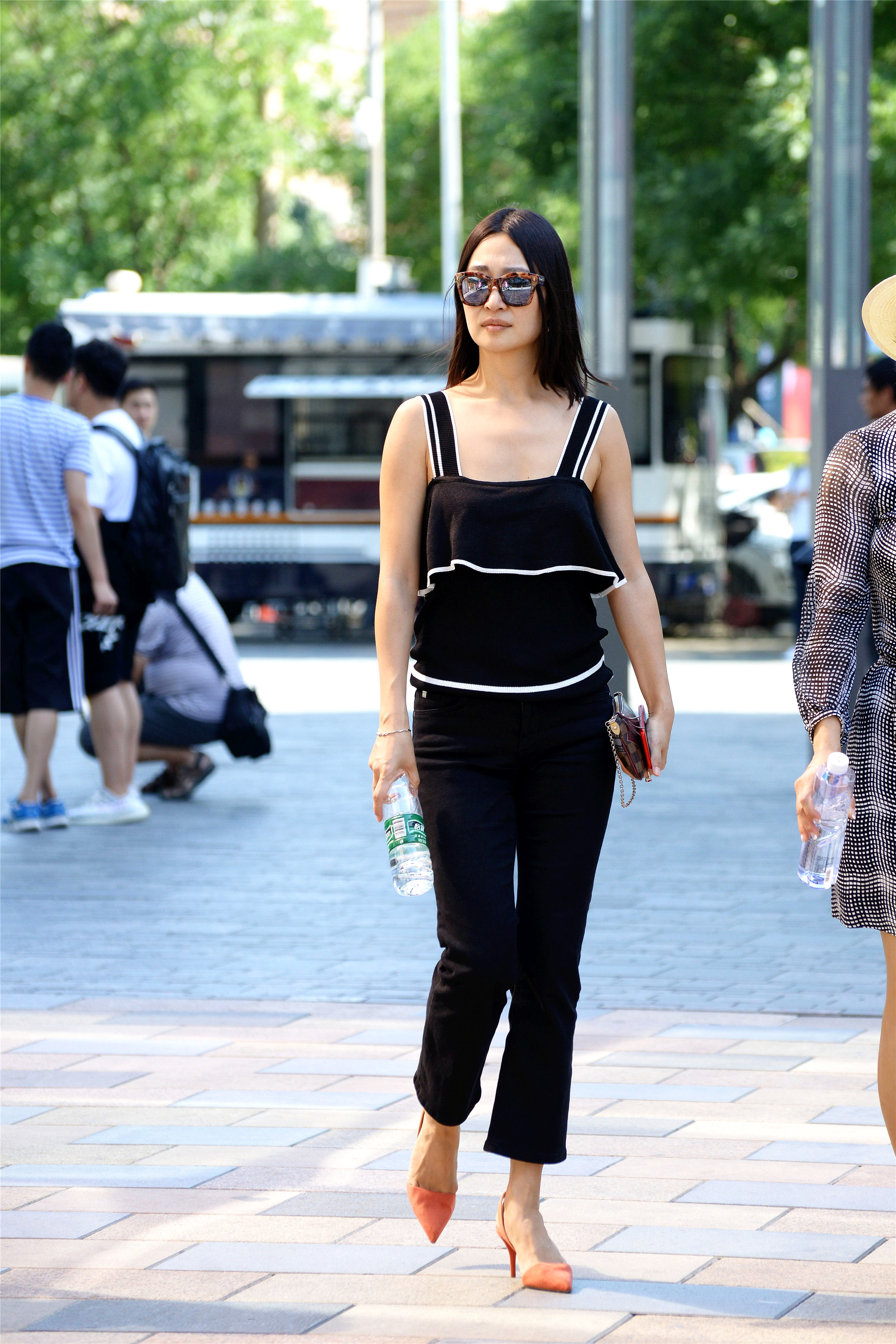 身材略显丰腴的姐姐,她选择一件黑色吊带,秀出肩部位置,一双红色尖头细跟鞋非惹眼,一眼就会让你注意到。