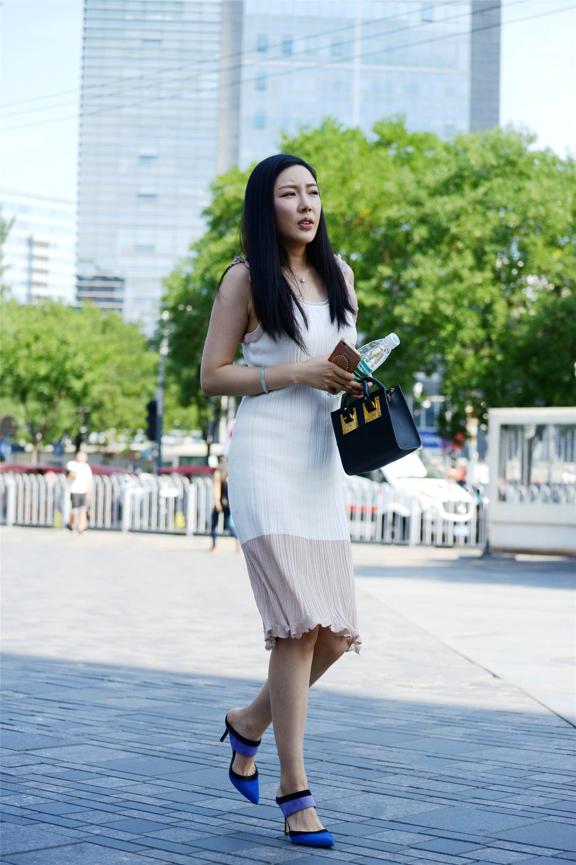 白色压褶连衣裙,无袖的款很显身材,还有裙摆处的拼接色也很漂亮,一双蓝色尖头细跟鞋,更有着拖鞋的感觉,却非常漂亮。