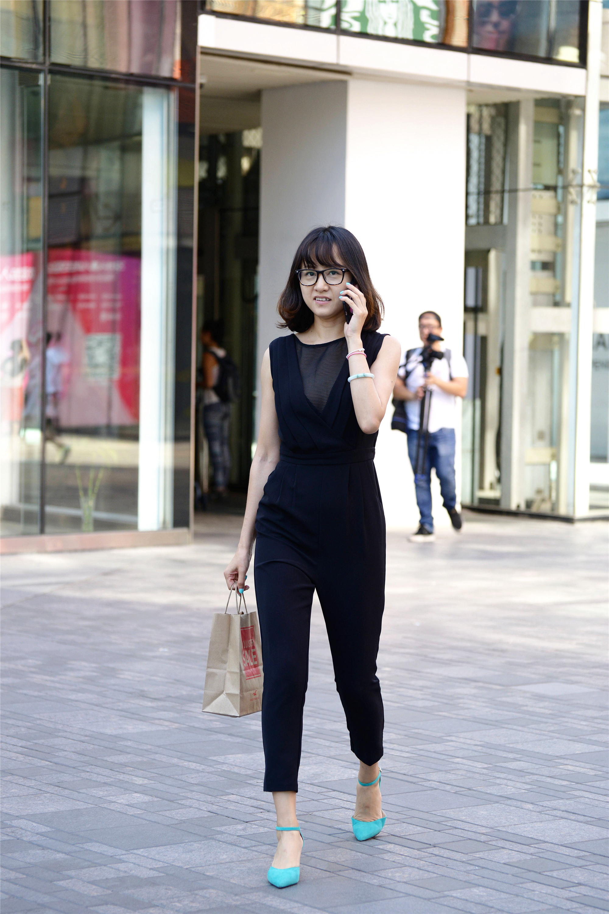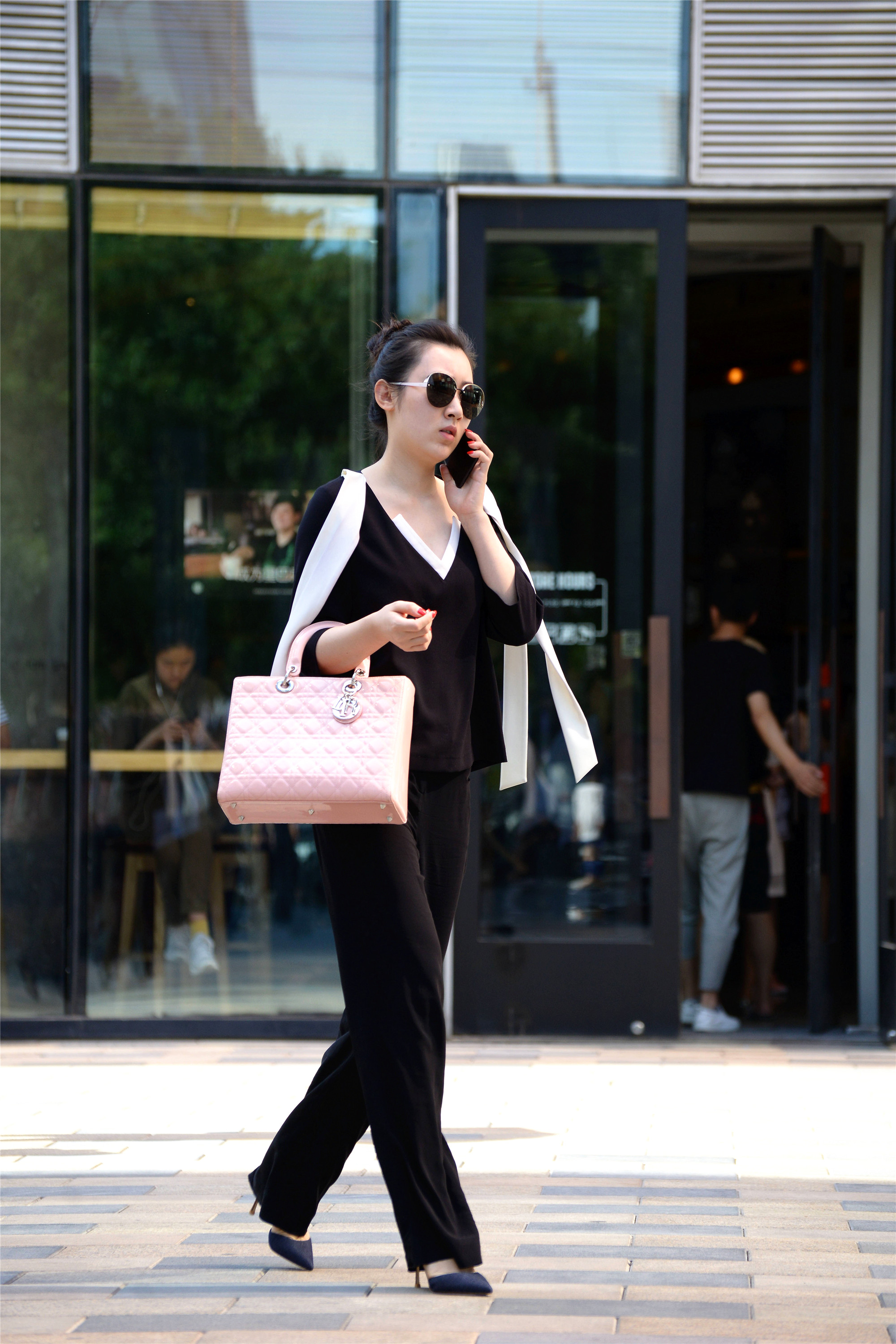 小姐姐这一套垂性特别好的黑色服装,显得特别有气质,衣服上垂下白色带子,即带着对比的感觉,又增加层次变化,一双深蓝色尖头细跟鞋更好的衬托她的气质。