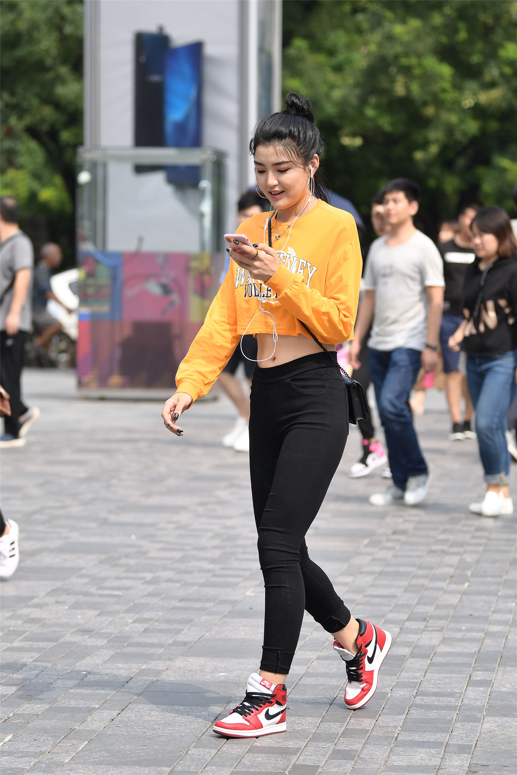 黑色的瑜伽打底裤,脚下的耐克运动鞋,运动风格十足,一件长袖的橘黄色短上衣,秀出一点腰腹部,展示她运动的成果。
