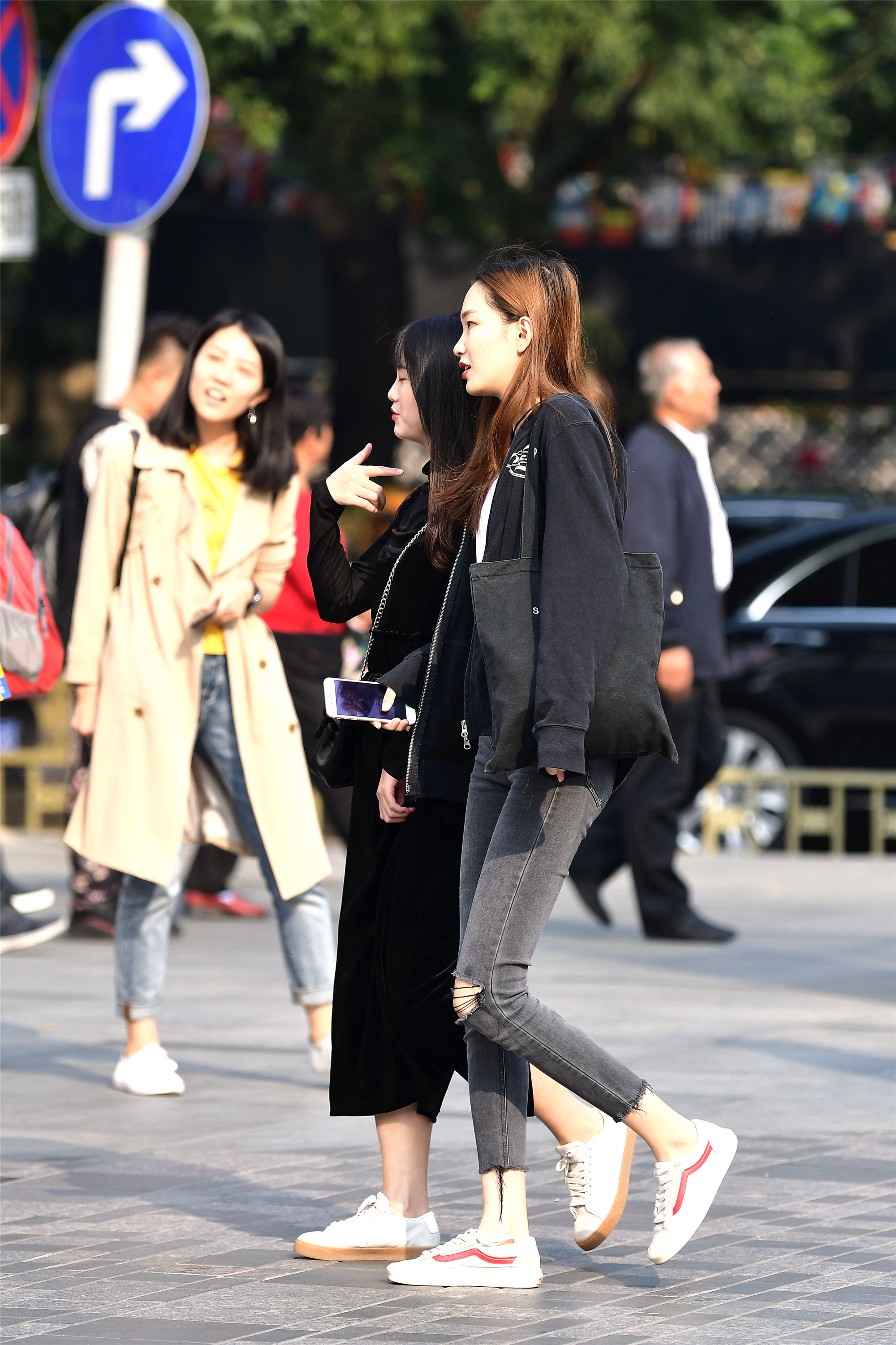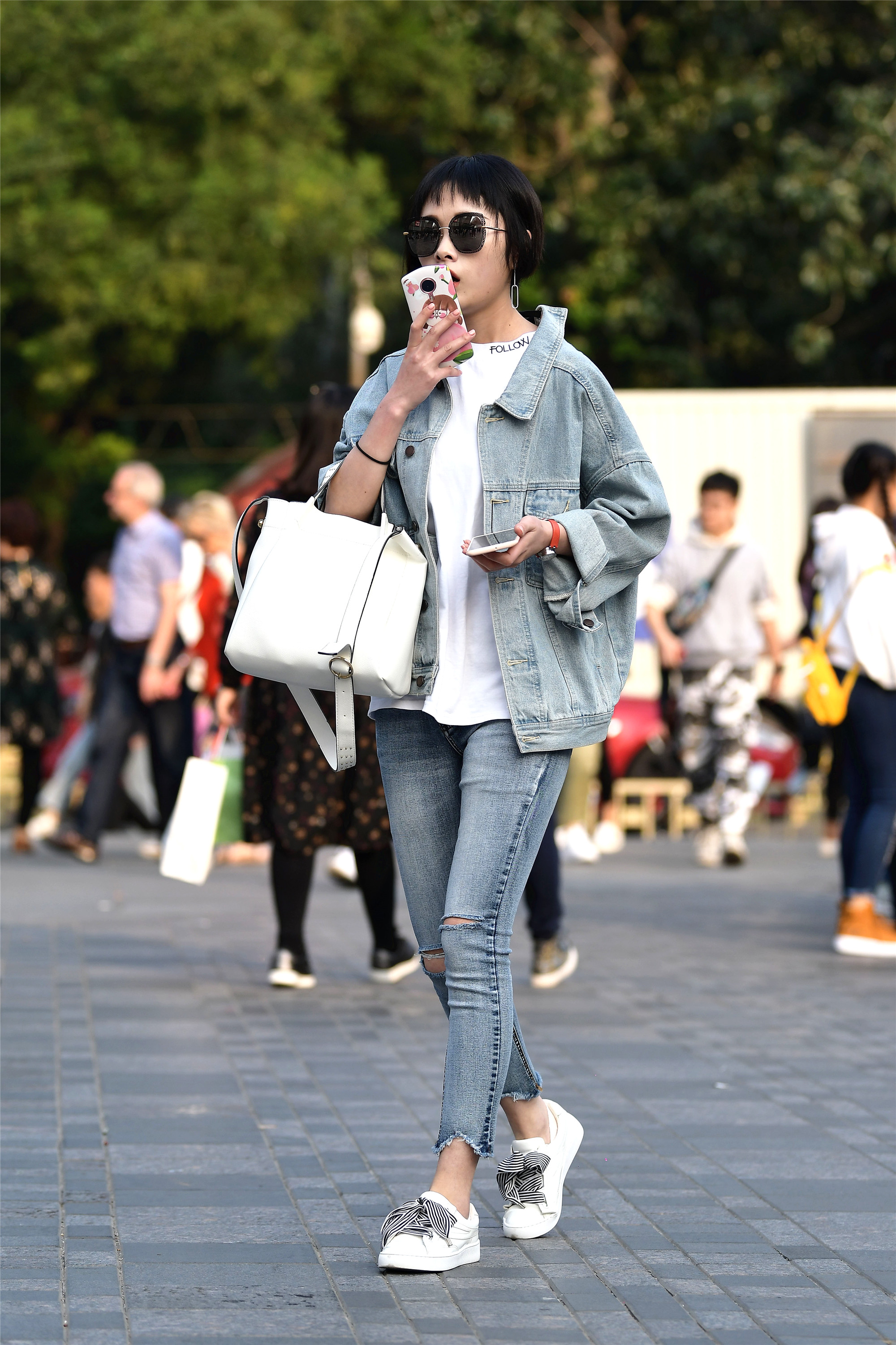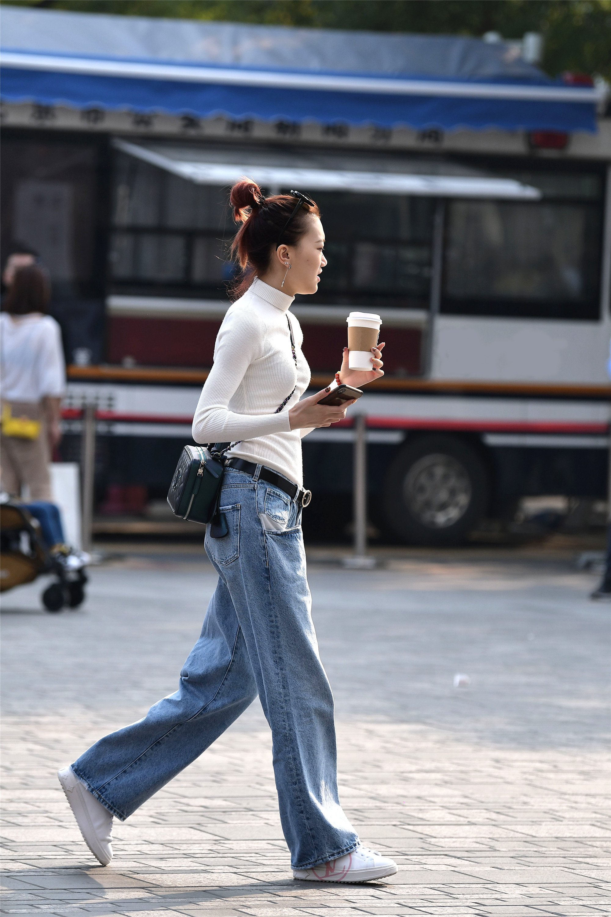 北方到了十月,微冷的时节,行人的搭配也在加厚,牛仔裤在这个时节是最好、最方便的搭配,时尚的姑娘们她们穿着自己喜欢的牛仔裤,在时尚街头绽放自己的活力。