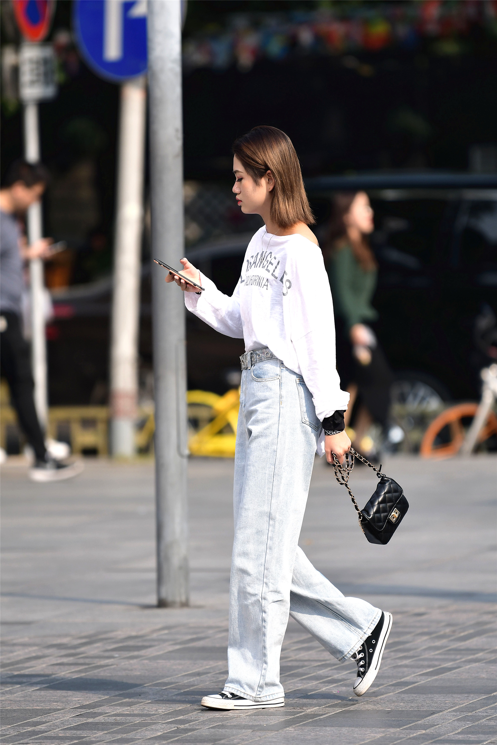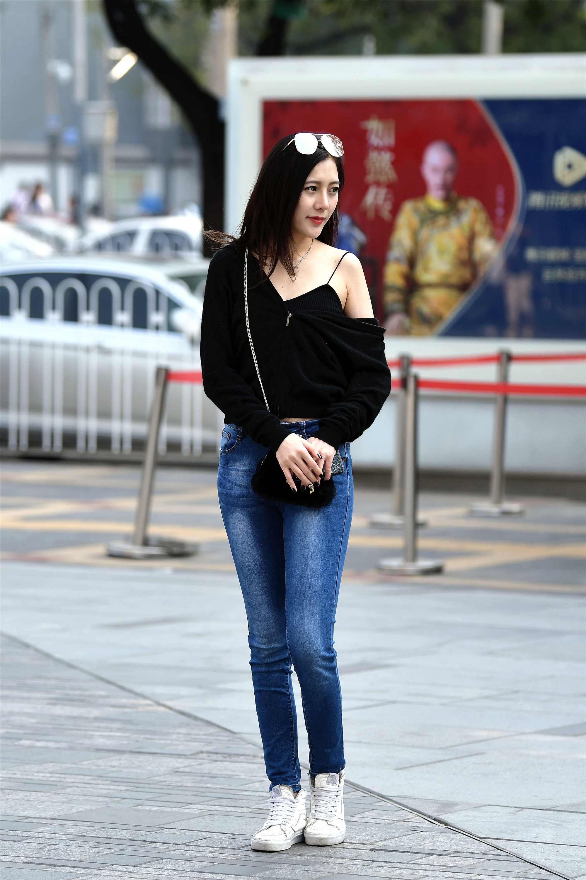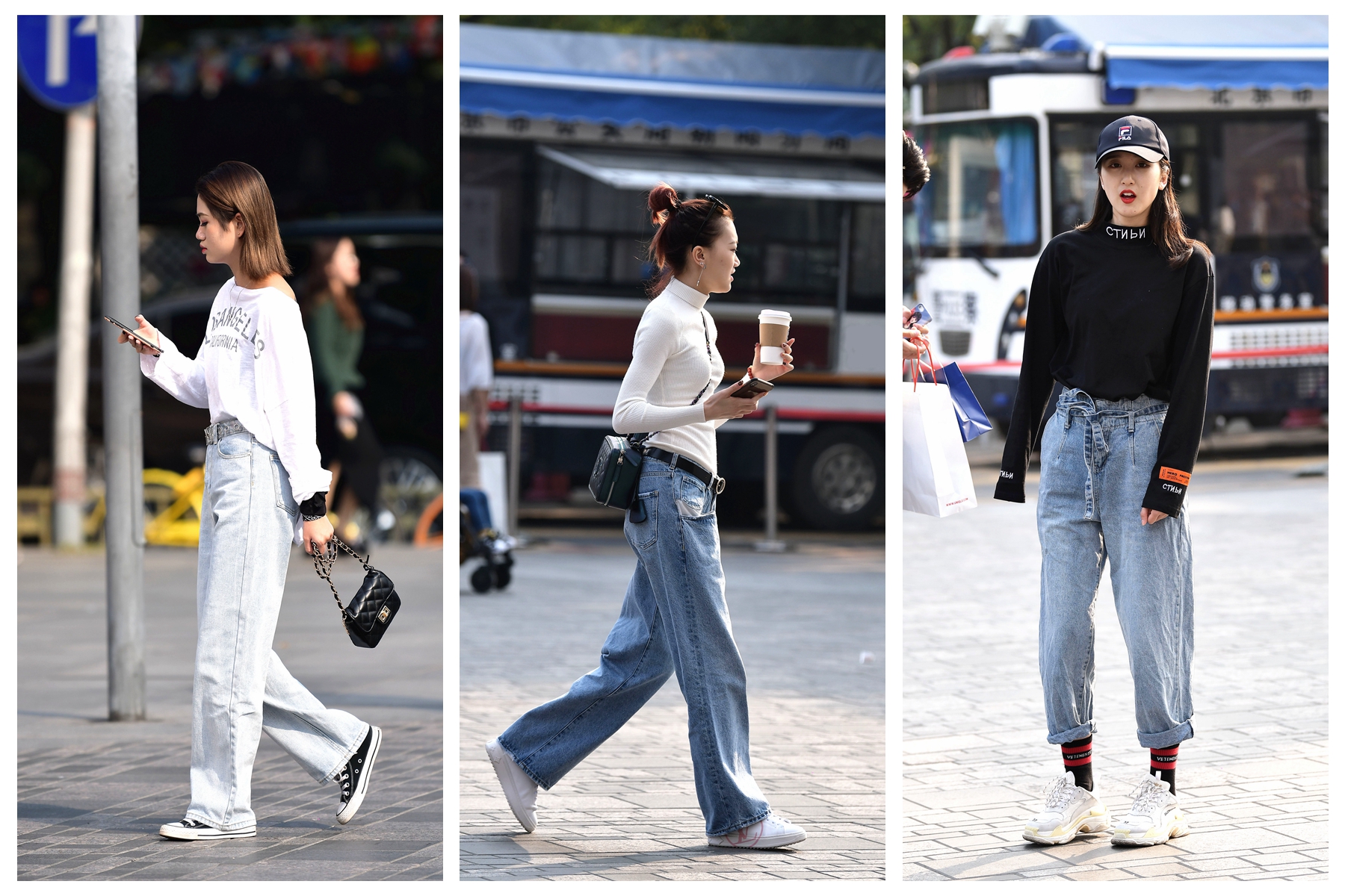 北方到了十月,微冷的时节,行人的搭配也在加厚,牛仔裤在这个时节是最好、最方便的搭配,时尚的姑娘们她们穿着自己喜欢的牛仔裤,在时尚街头绽放自己的活力。