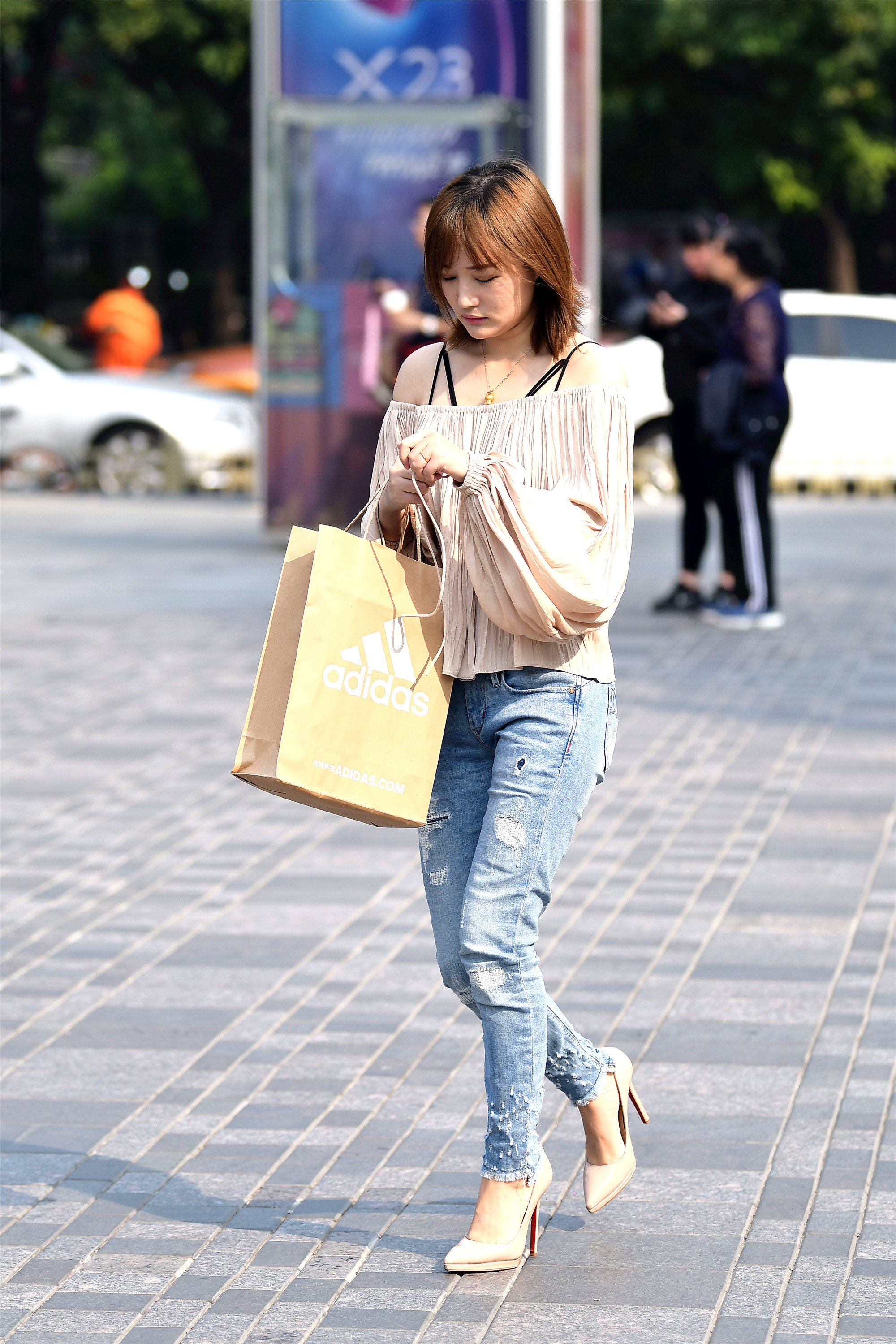 压褶的一字肩,米粉色和肤色非常贴近,牛仔的乞丐裤,也是非常时尚靓丽的,一双尖头细跟鞋,走起路来自然又稳妥。