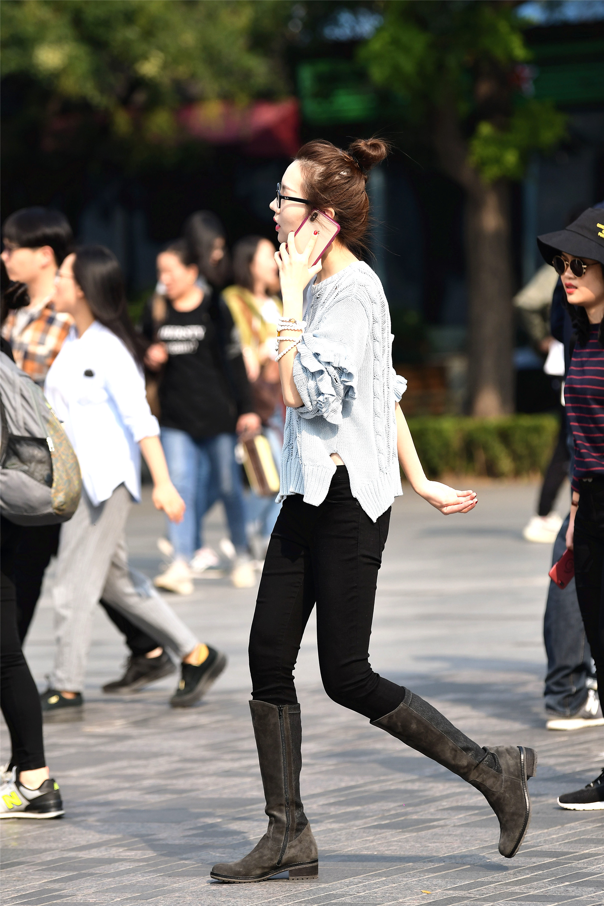 黑色牛仔裤搭配一双长靴,是不是秋天的感觉更浓一些,针织长袖也层次感,也和整体的风格很贴近,在人群中,她是那样的独特。