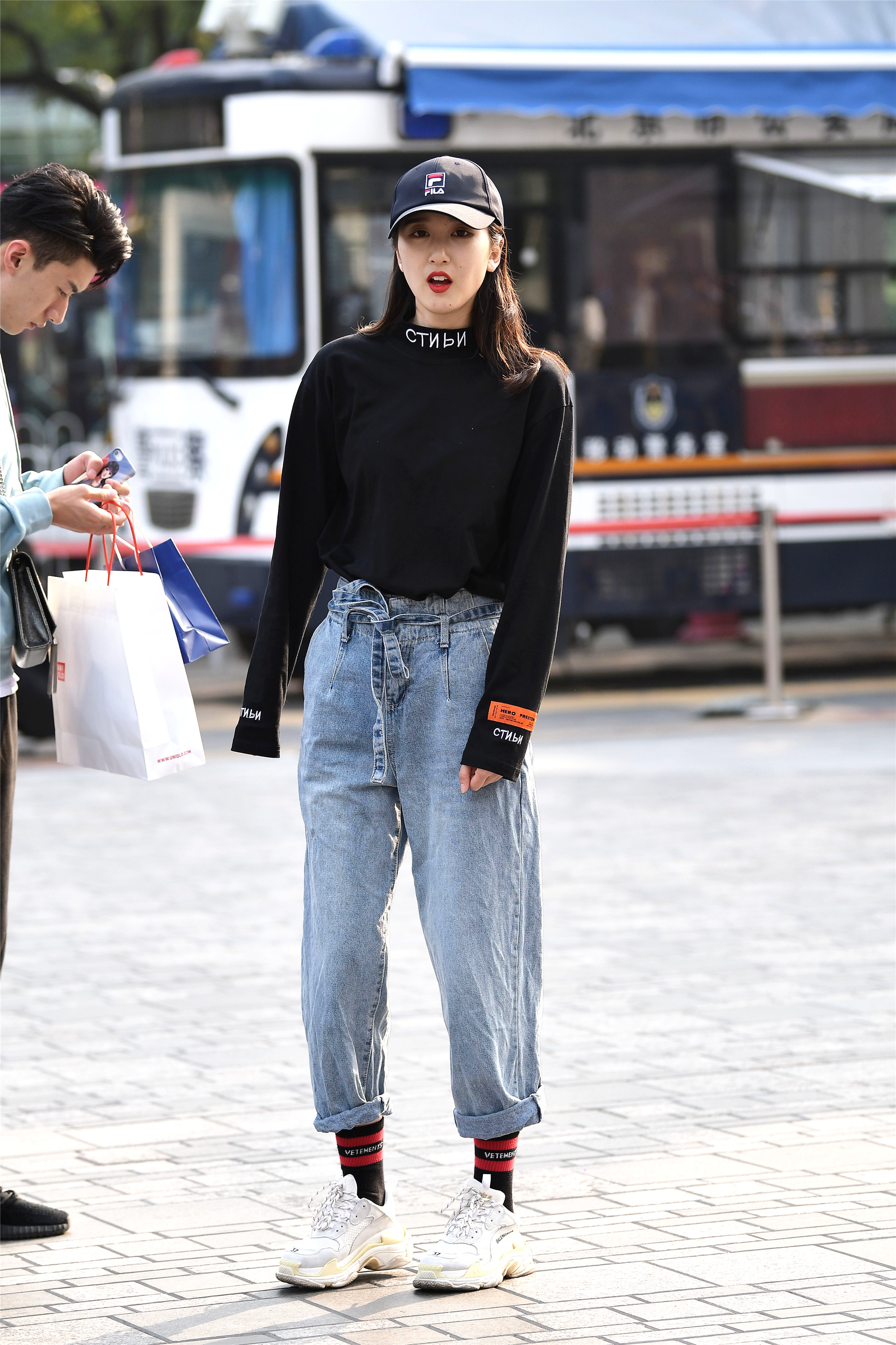小姐姐一身搭配很有个性,高腰牛仔裤的腰带是牛仔长布条系起来的,裤脚挽起,露出高筒袜和运动鞋,黑色高领长衫,不仅保暖,还可以把手收在袖子里面,一顶鸭舌帽,又会带着嘻哈的感觉。