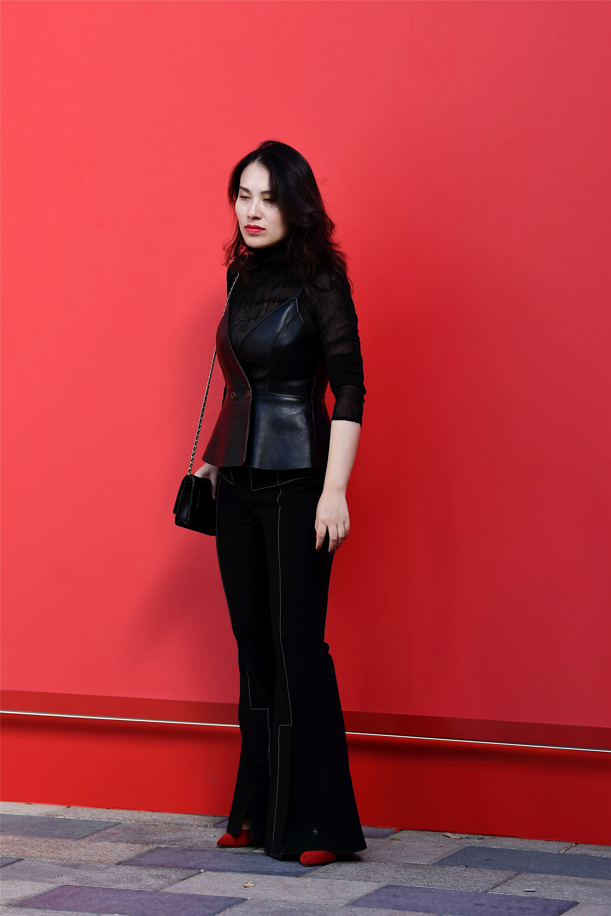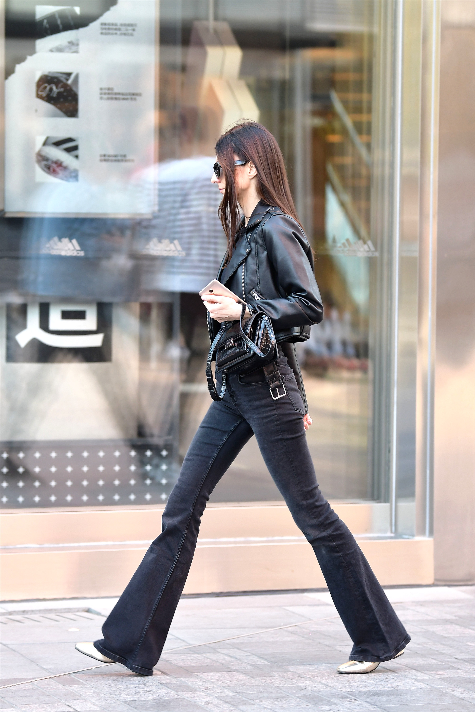 一身黑色,似乎是到了深秋时节,很多人都会选择,但是搭配出来有层次感,还要秀出自己身材,这需要你认真的搭配一下,牛仔喇叭裤,到了膝盖位置裤腿才散开,要选择一双高跟鞋撑起来,这样身材高挑,还有曲线感,搭配一件皮夹克,层次感也出来了。