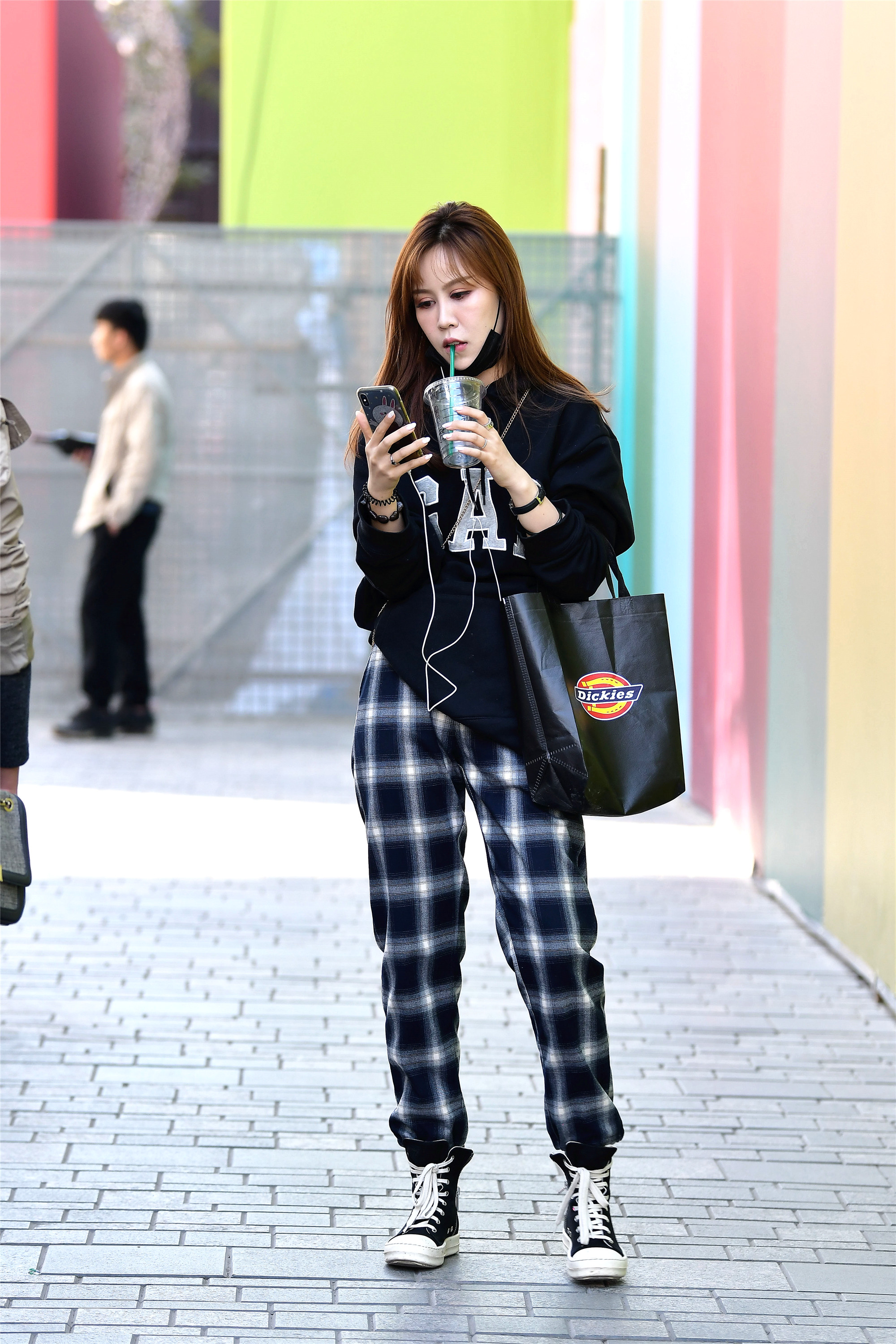 一条黑白色条格裤子,一件简单的黑色卫衣,卫衣一侧衣角被掖在条格裤子里面,这样露出一点裤腰所在位置,就会感觉身材比例很好,这是搭配的一点小心机。