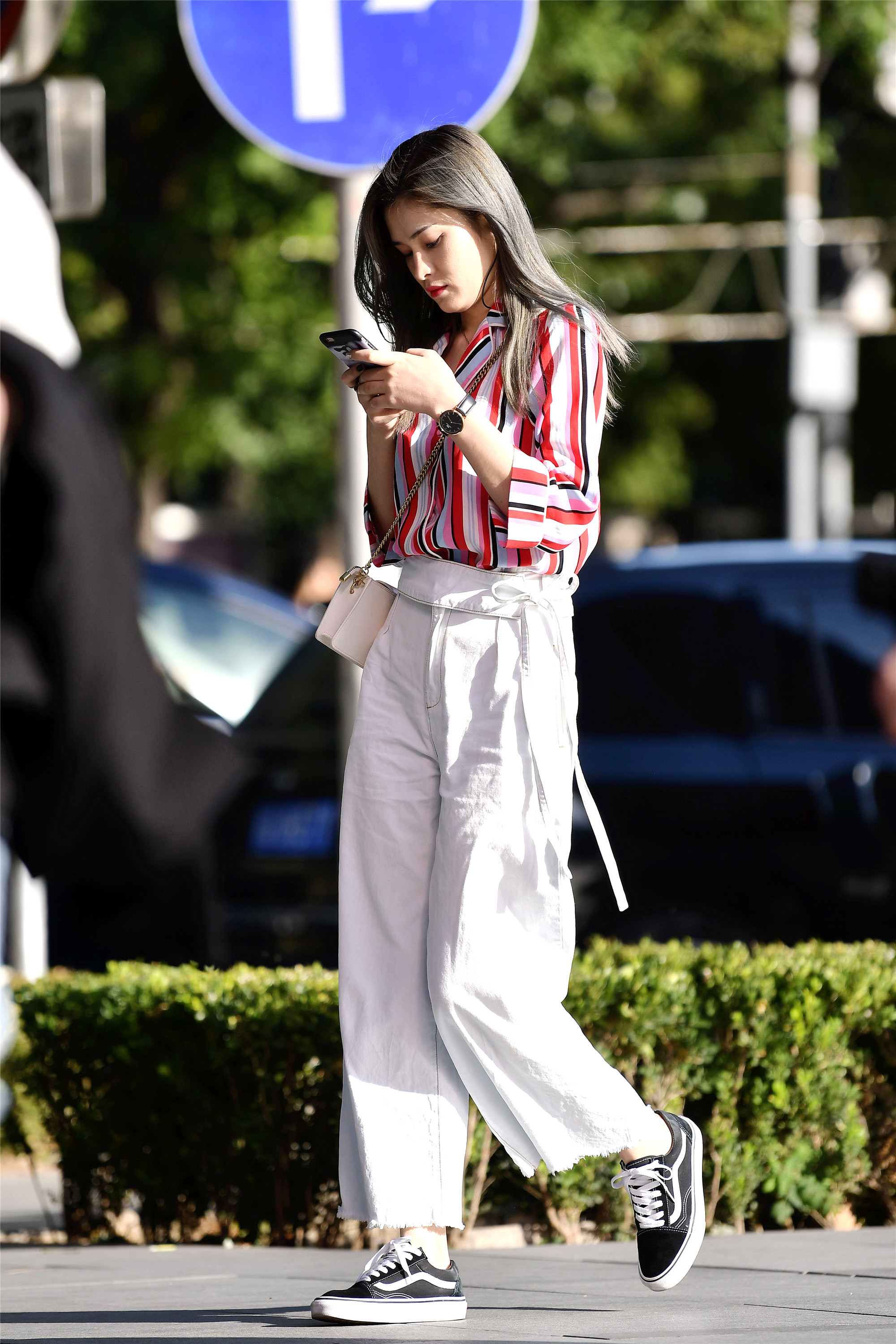 白色高腰裤,款式的款式和搭配的白色和红色的条格衬衣,非常显身材比例,即使是穿着平底鞋,依旧有长腿的效果,而且从侧面看,小姐姐非常精致。