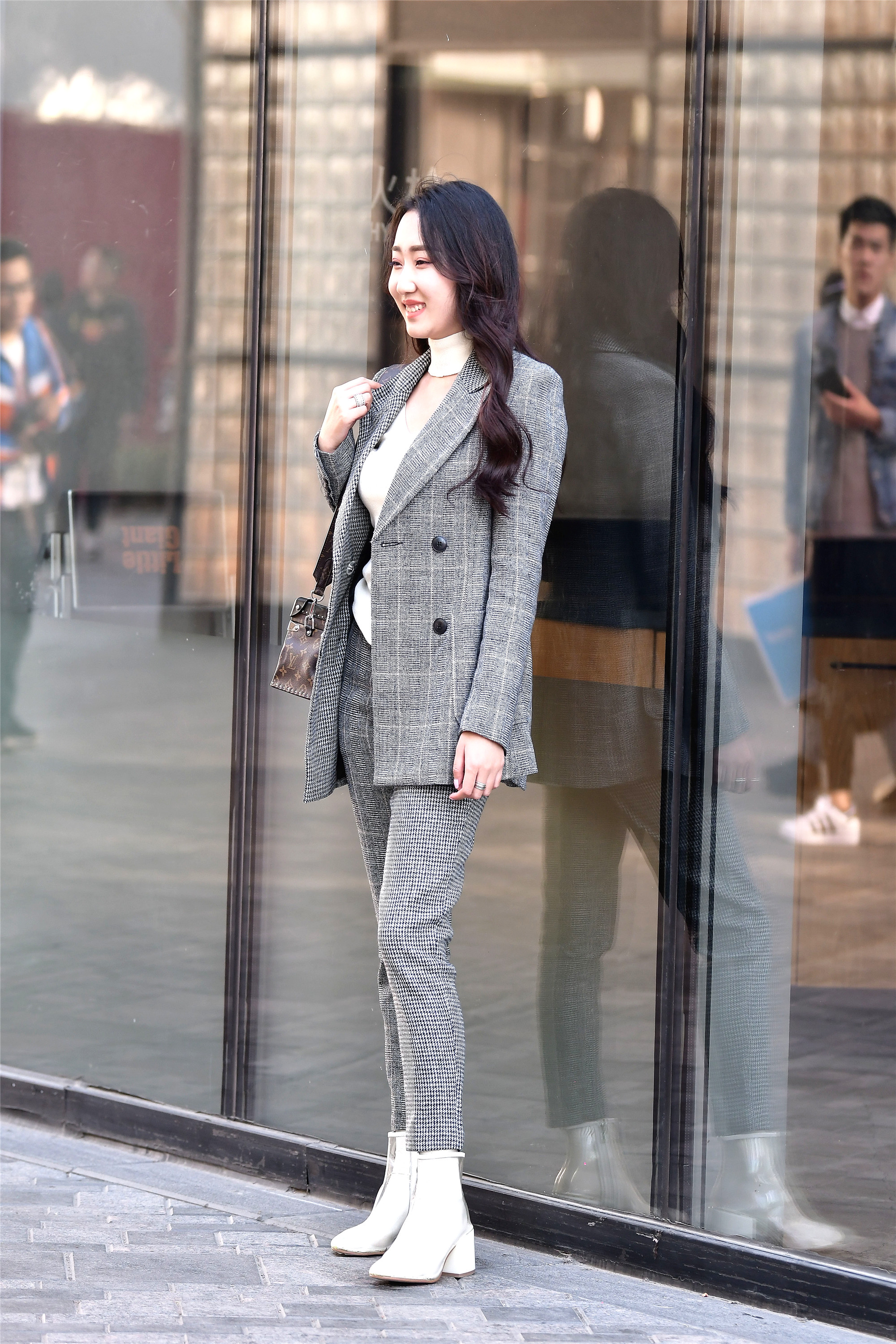 小姐姐是一套西装搭配,显得分成干练的味道,细格子会增加层次感,也会增加气质感觉,浅灰色的视觉会显得皮肤白皙,她脚下搭配着一双白色的短靴,增添戏剧性和冲突感觉。