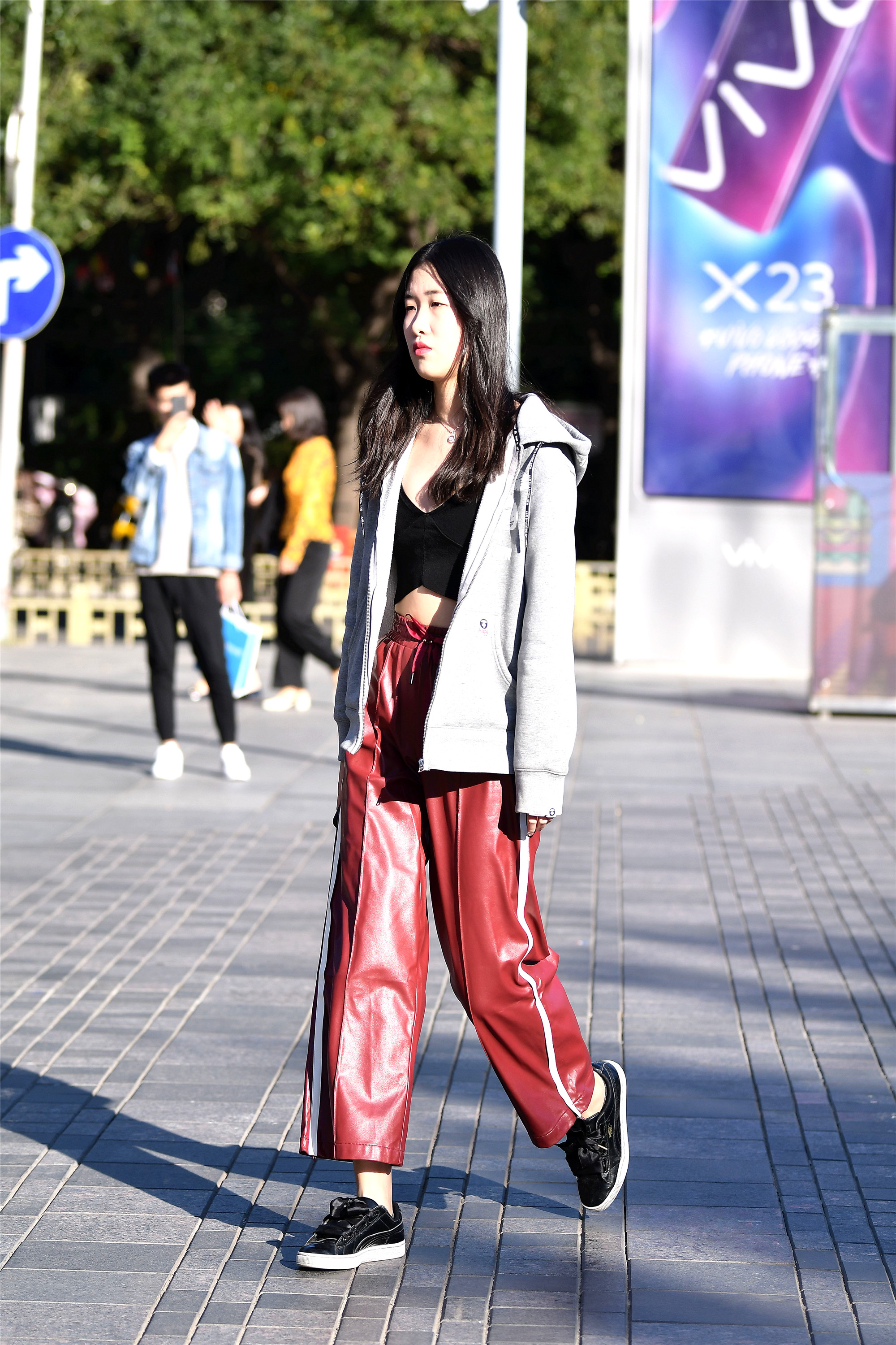 高腰的皮裤,红色很显眼,也很鲜艳,黑色的文胸和运动外套,这样的混搭风格,显身材比例,有带着不同的风格,却又体现年轻人的态度。