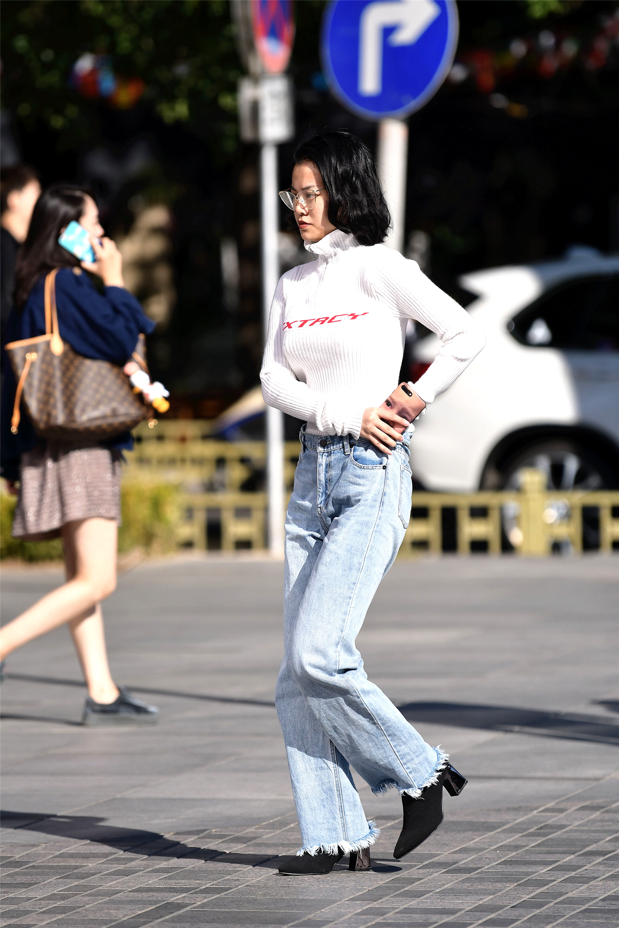 高腰的天蓝色牛仔裤搭配着白色高领毛衣,典型的秋季搭配,感觉利落的感觉让你察觉到小姐姐做事风格也是很干脆的,一双方跟尖头鞋,衬托毛绒绒的裤脚,也显身材高挑。