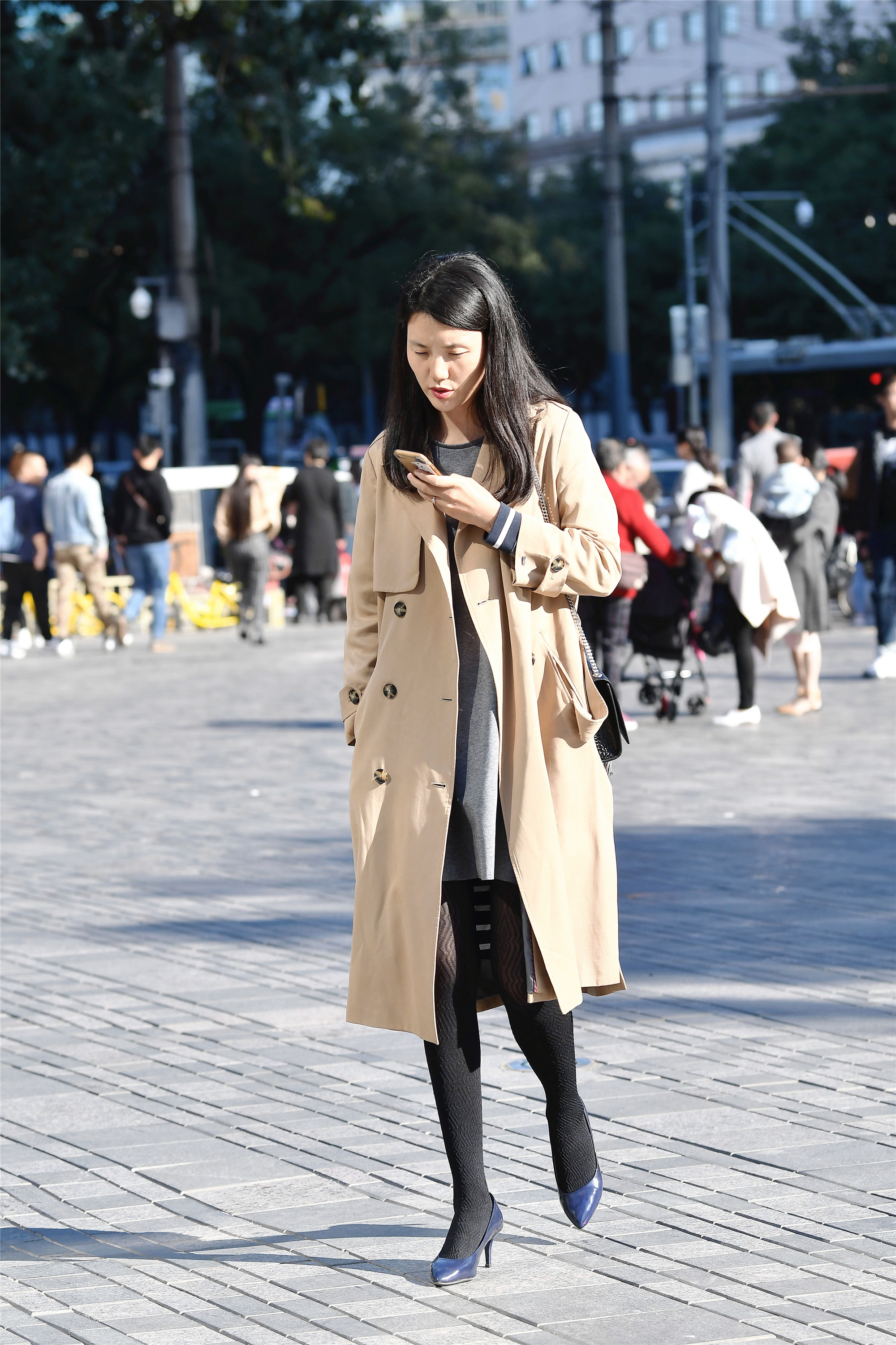 这个时节,穿着风衣是非常合适的,而米色风衣,暖色调一直很流行,深受很多人喜欢,也属于百搭的服装,一双深蓝色的尖头细跟鞋,在黑丝的映衬下,那样的优雅自然。