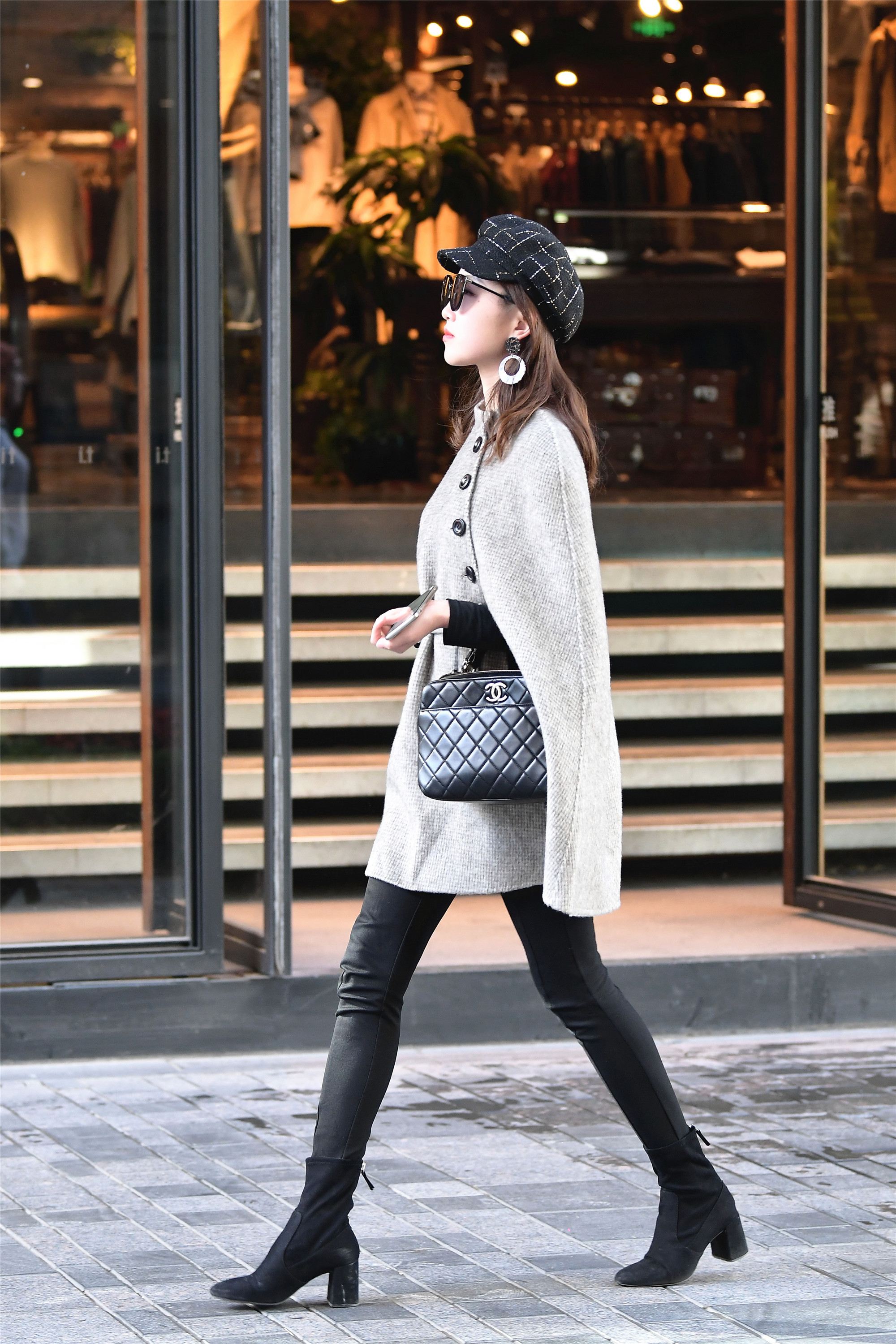 一件蝙蝠外套,可以将手都收回来,一条打底裤秀出她的纤细长腿,一双黑色短靴就是这样自然的搭配,显出来她的优雅气质。