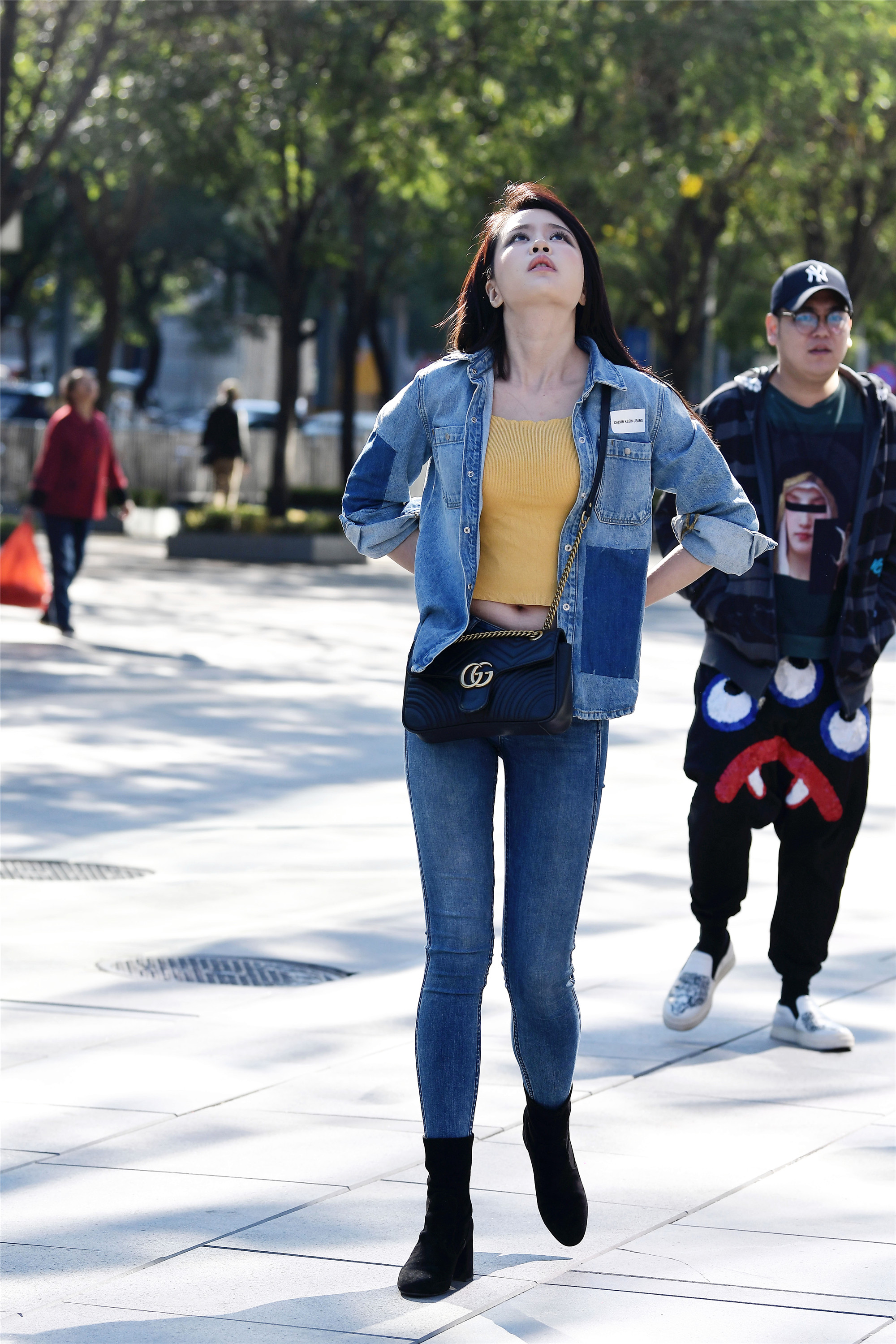 一身的牛仔装,简单大气的感觉,看着小姐姐身材很不错,这是需要身材好才能看到这样的效果,敞怀的牛仔服,秀出她的黄色内搭,隐约可见的肚脐,这就是最好的露脐装搭配。