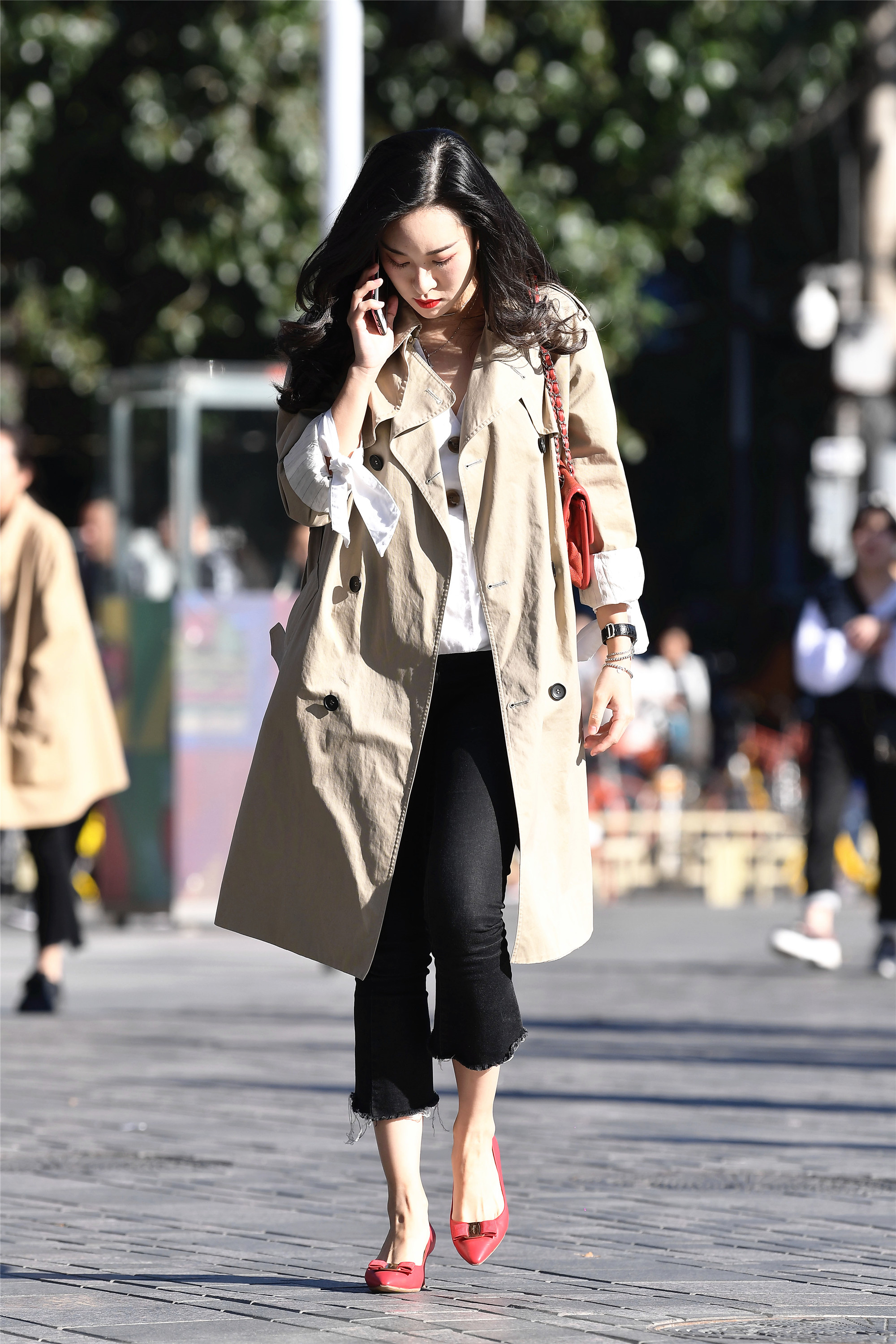 米色的风衣,白衬衣搭配一条九分牛仔裤,简单的黑白撞色,却搭配出长腿的效果,一双红色尖头细跟鞋,衬托她的身材比例。